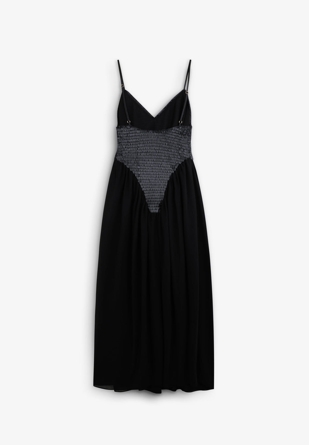 Dress made of flowing fabric and sequins. Sequined bodice, V-neckline and thin adjustable straps. Skirt with a slight flounce.