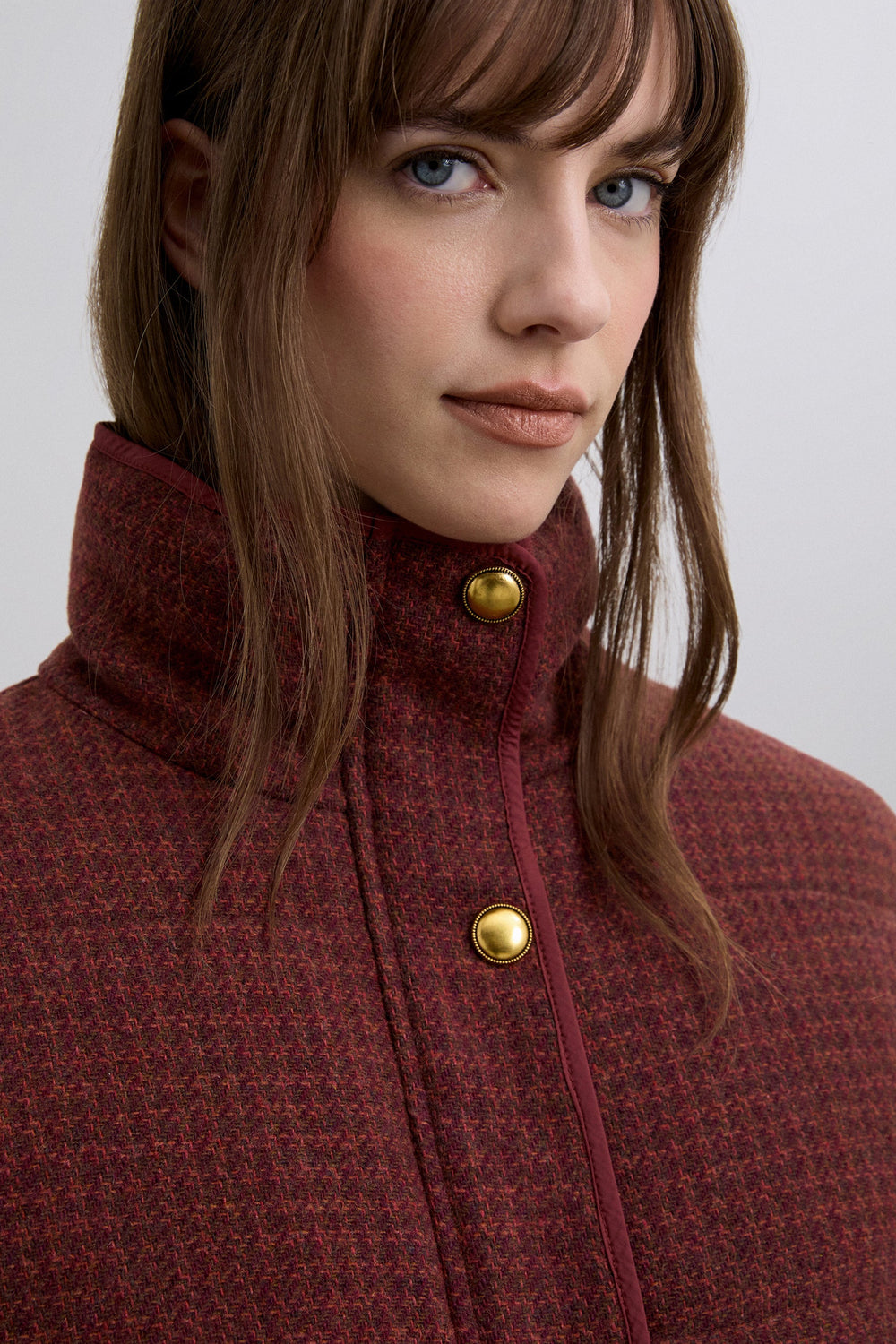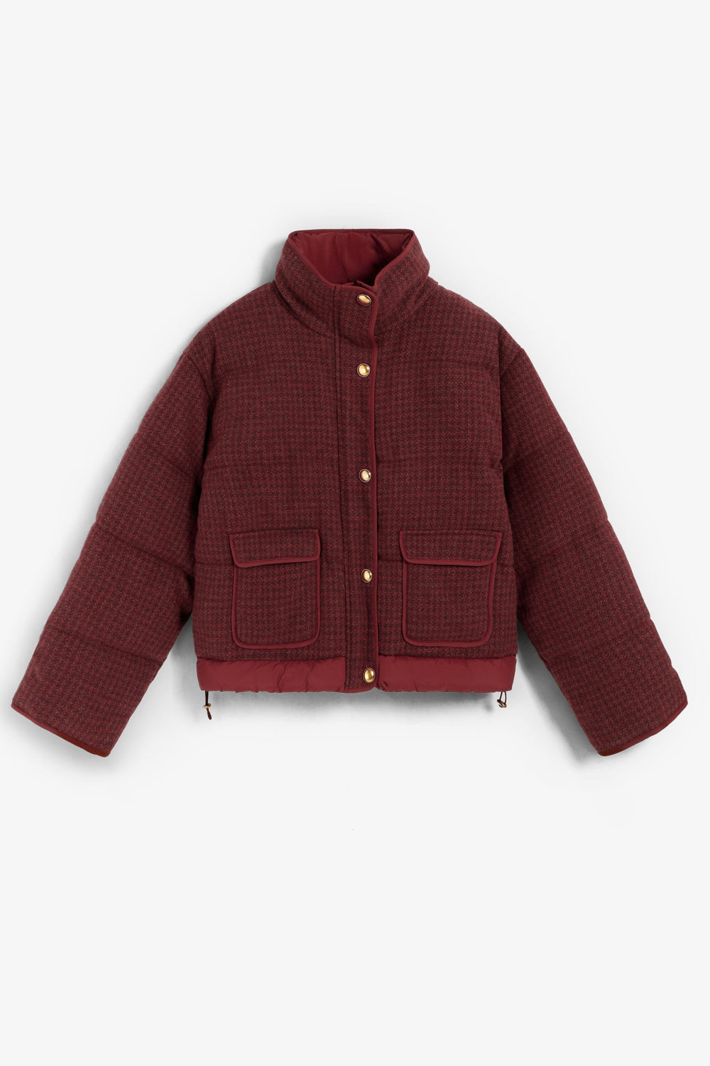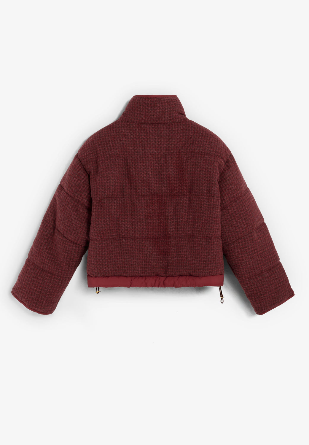 Padded coat made of a wool blend fabric with check print. Regular fit. Slightly cropped. High collar. Long sleeves. Contrast piping. Centre zip fastening and placket with metal press studs. Adjustable pull tabs on the hem.