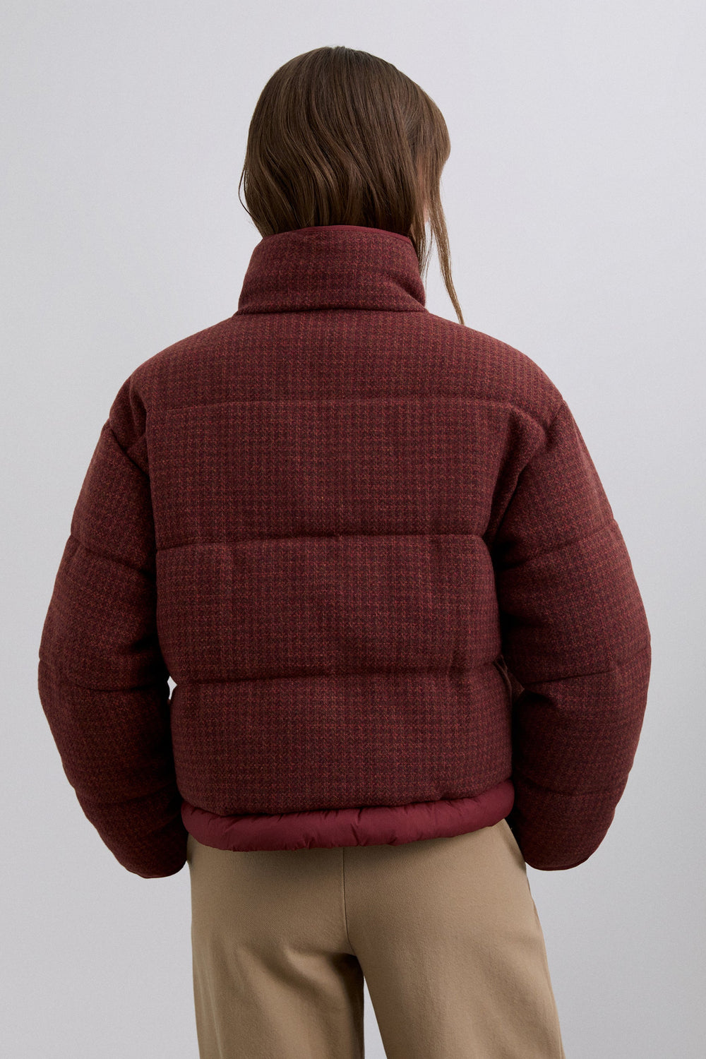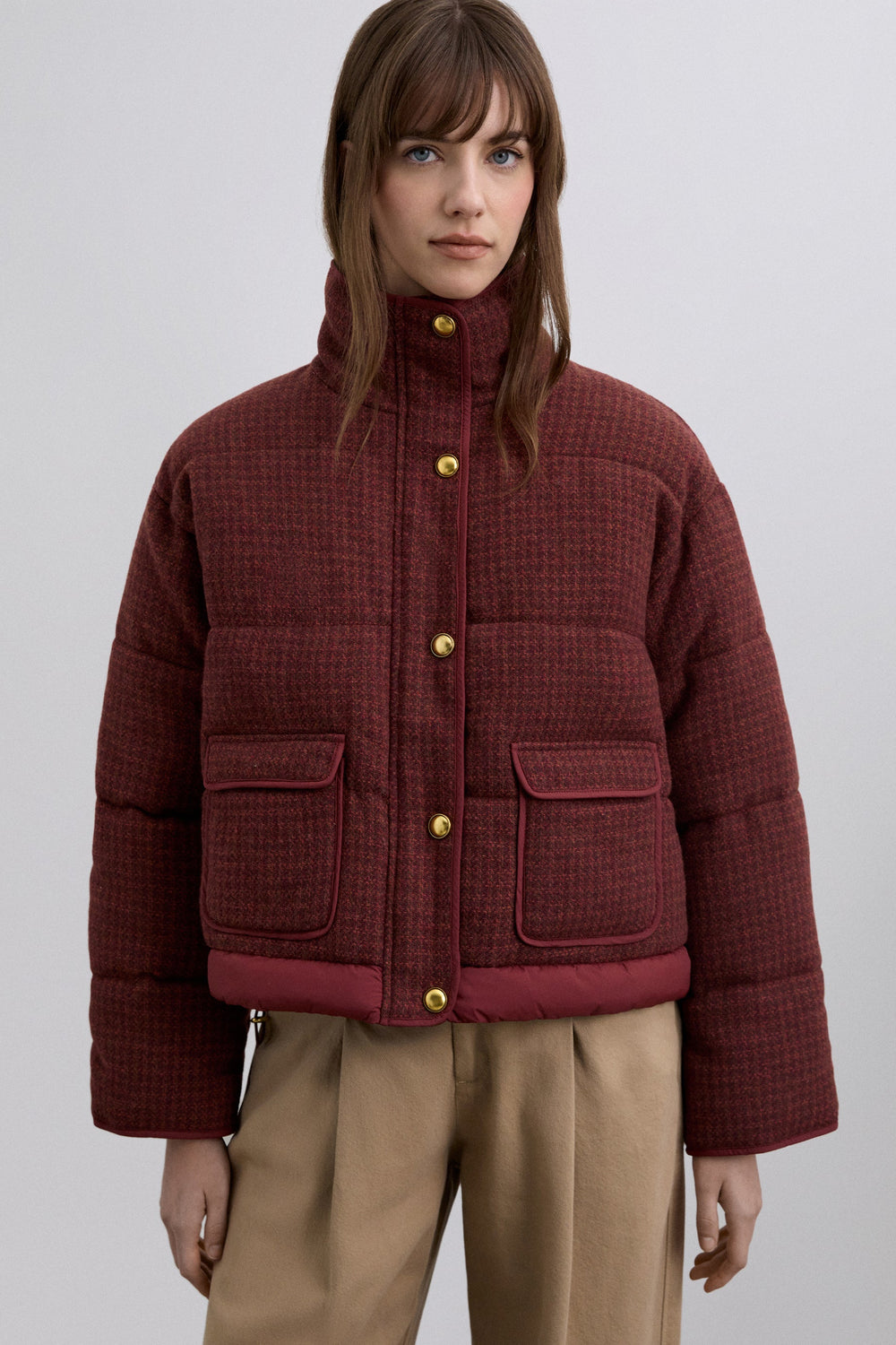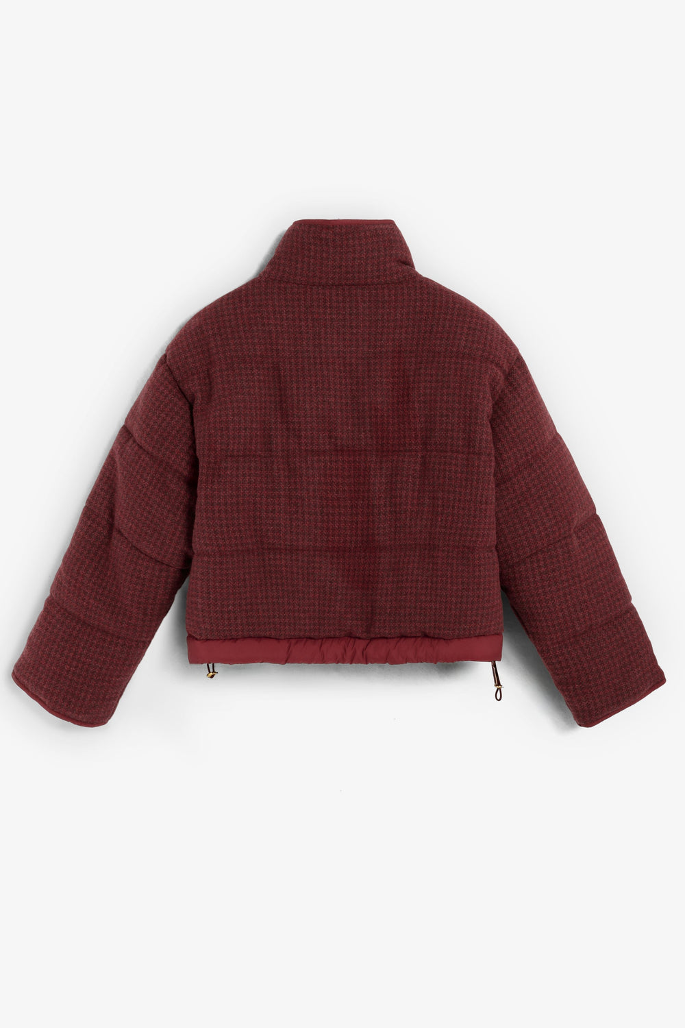 Padded coat made of a wool blend fabric with check print. Regular fit. Slightly cropped. High collar. Long sleeves. Contrast piping. Centre zip fastening and placket with metal press studs. Adjustable pull tabs on the hem.