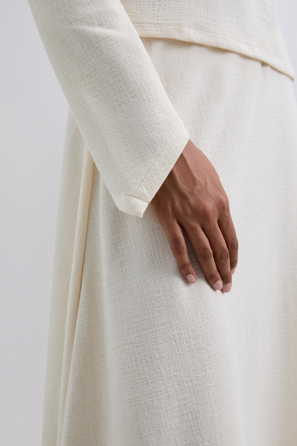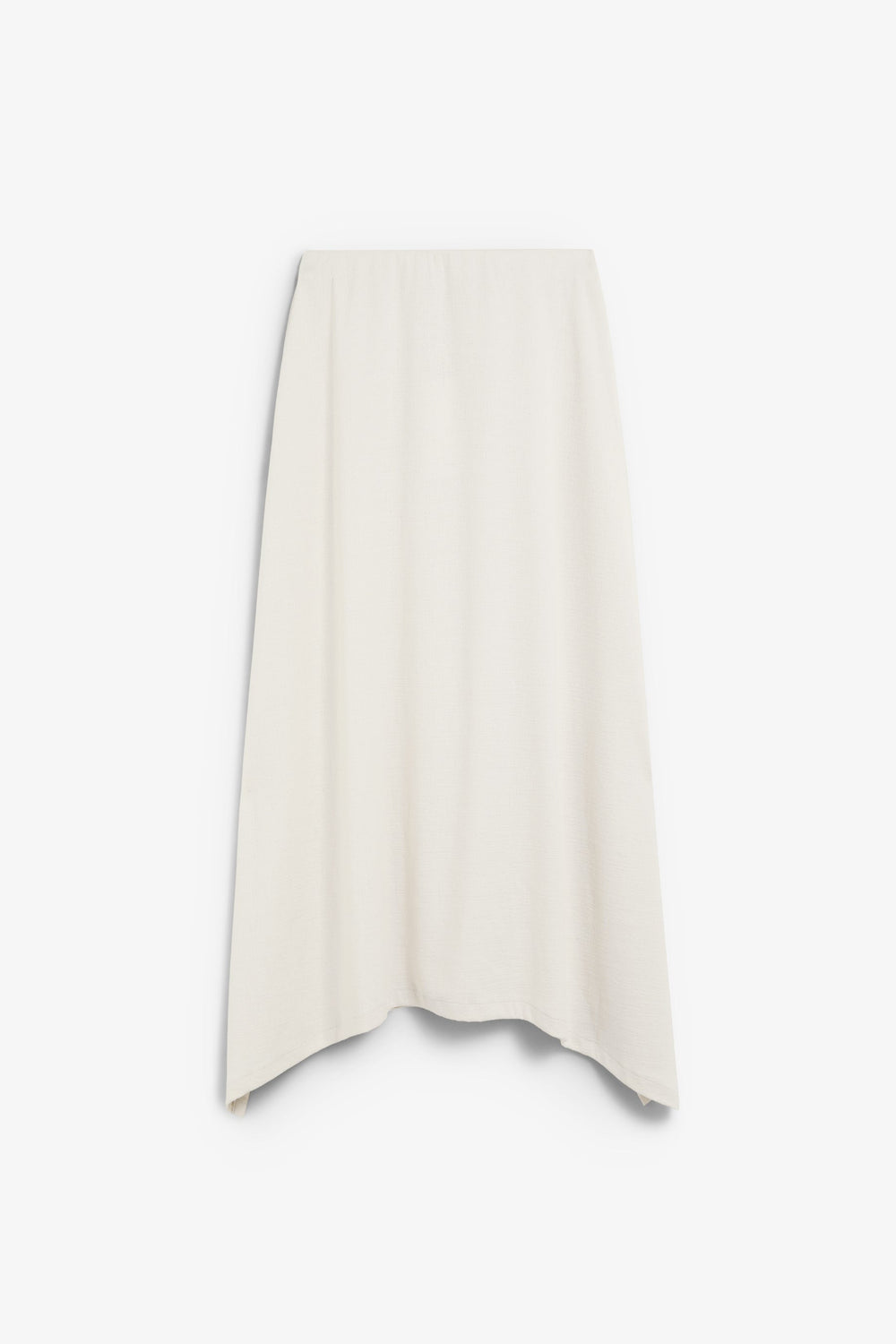 Chunky knit midi skirt made of 100% cotton. Regular fit, elasticated waistband and visible seams. Asymmetric hem.