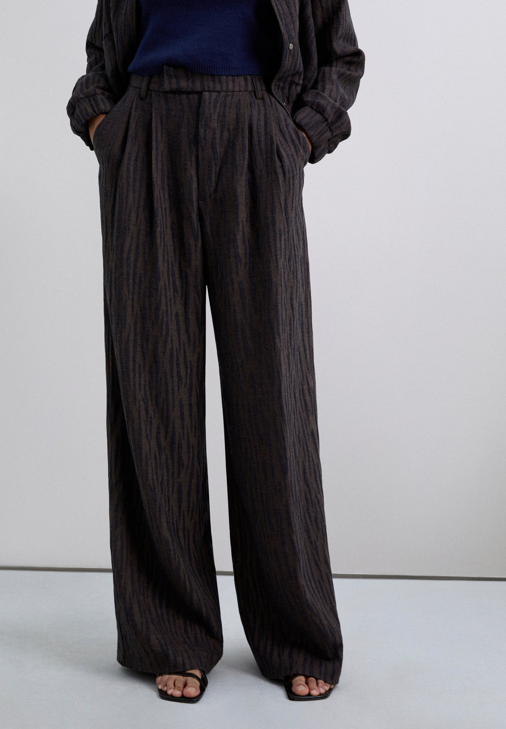 Trousers with zip fastening concealed by a placket, with hook and button. Two side pockets. Double dart detail on the front. Jacquard fabric with animal print.