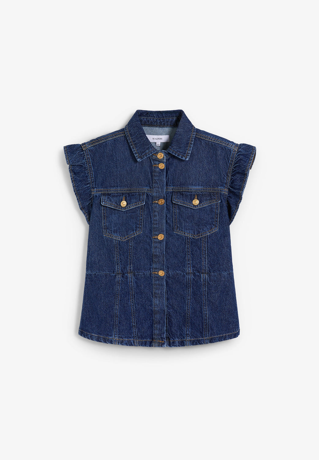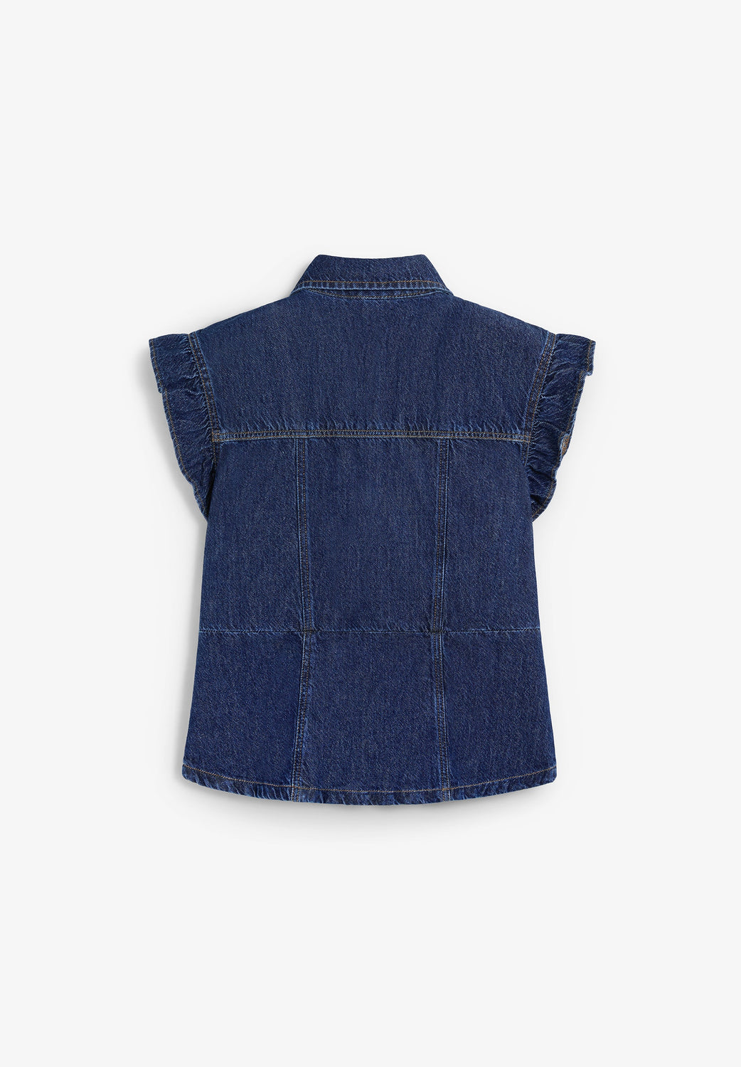 Denim shirt made of cotton. Shirt collar and metal button fastening at front. Features patch pockets with flap and button on the chest. Short sleeves with gathered ruffles. Back yoke and contrast stitching.