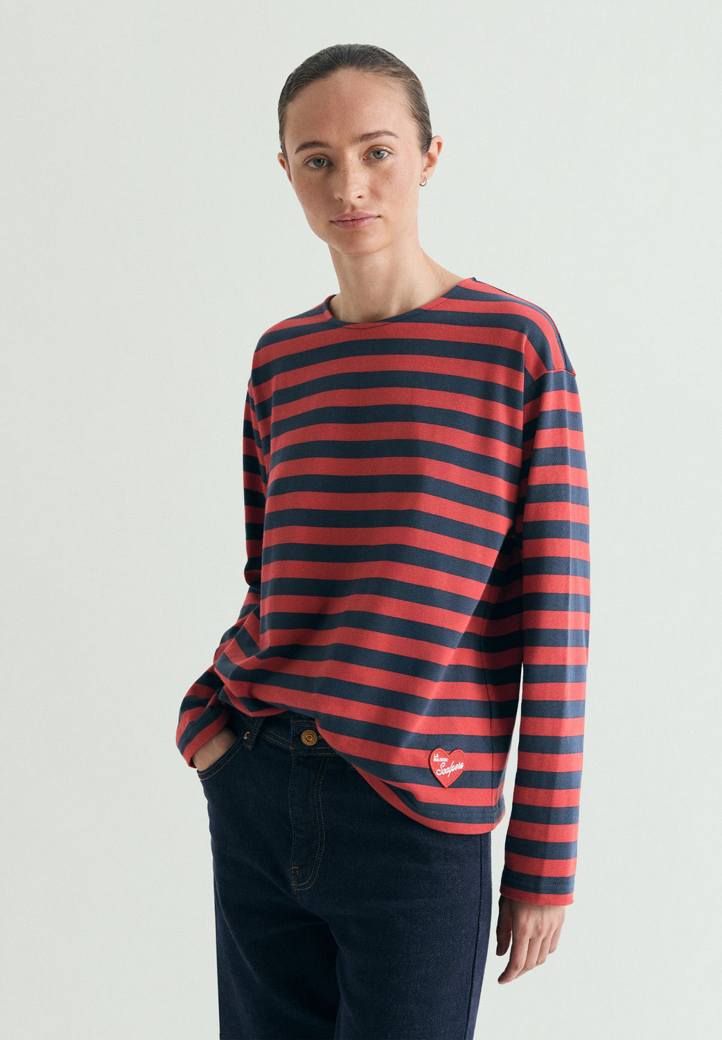 Striped T-shirt made of 100% BCI cotton. Regular fit, round neck and long sleeves. Logo patch detail on the front hem.
