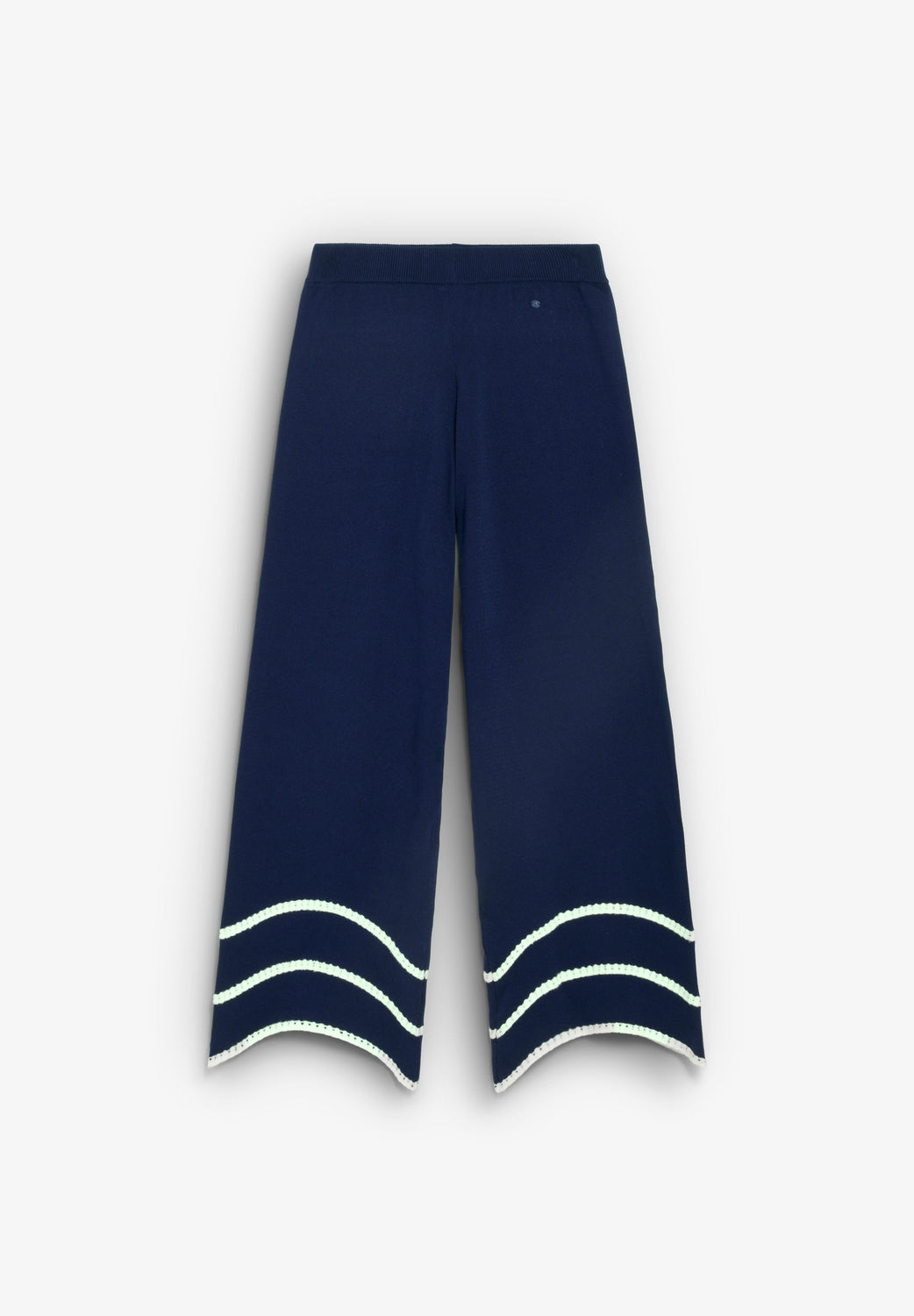 Fine knit trousers. High waist, relaxed fit. Elasticated waistband. Contrast details on the hem Back patch pockets.