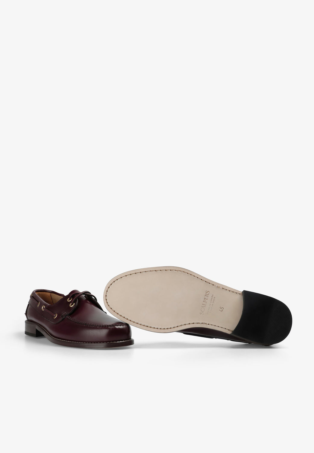 Nautical style shoes made of high quality leather with a shiny finish. Classic design with laces and metal eyelets, round toe and visible seams. With a leather insole for greater comfort and a stitched sole.