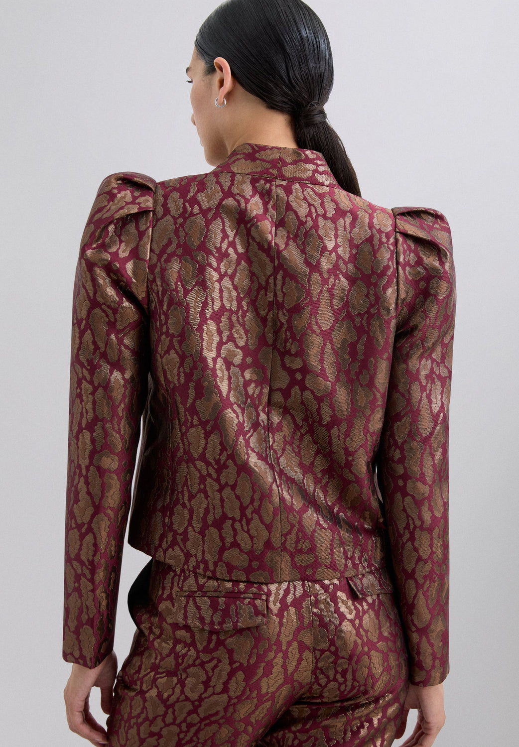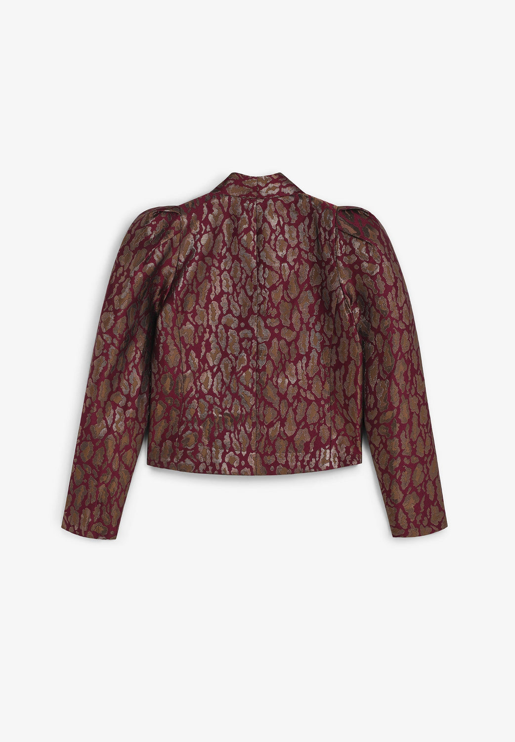 Cropped blazer in metallic-effect fabric with animal print. Slightly high collar. Long balloon sleeves with pleating at the shoulders. Fitted design with button fastening.