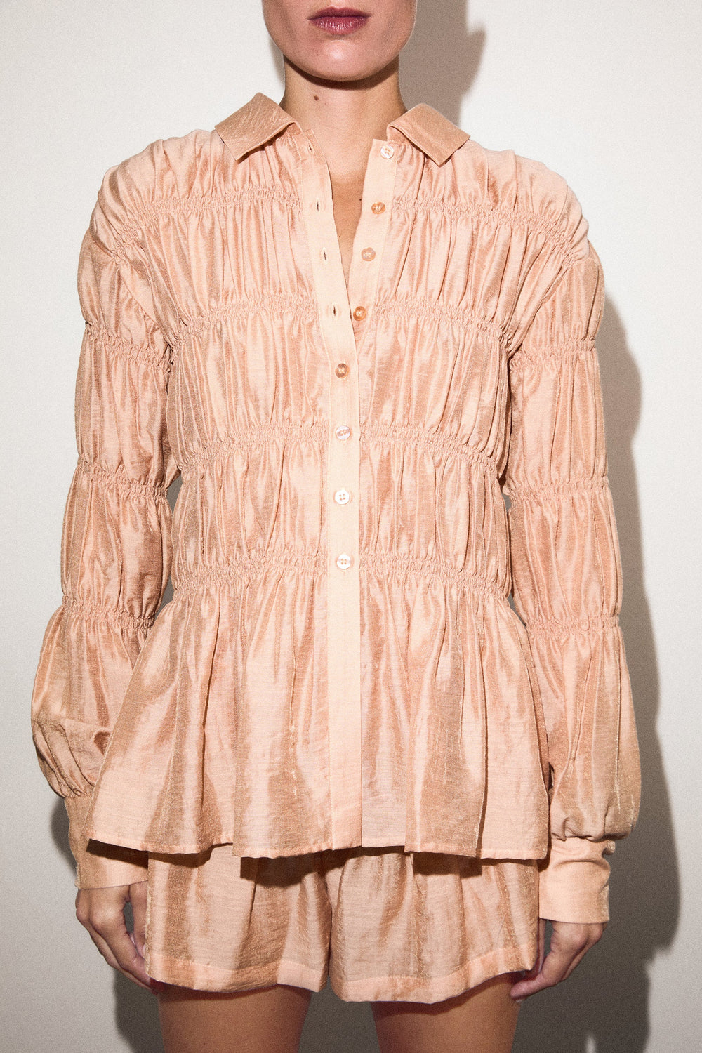 Shirt made of textured fabric. Long sleeves with smocking. Classic shirt collar fastening at the front. Slightly puffed long sleeves.