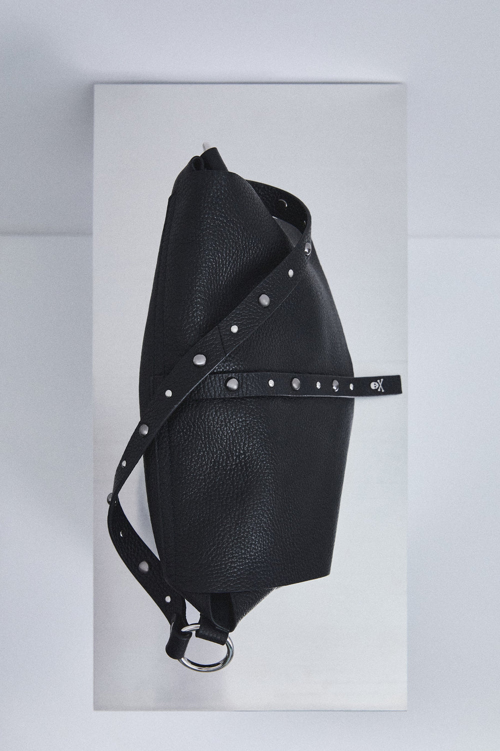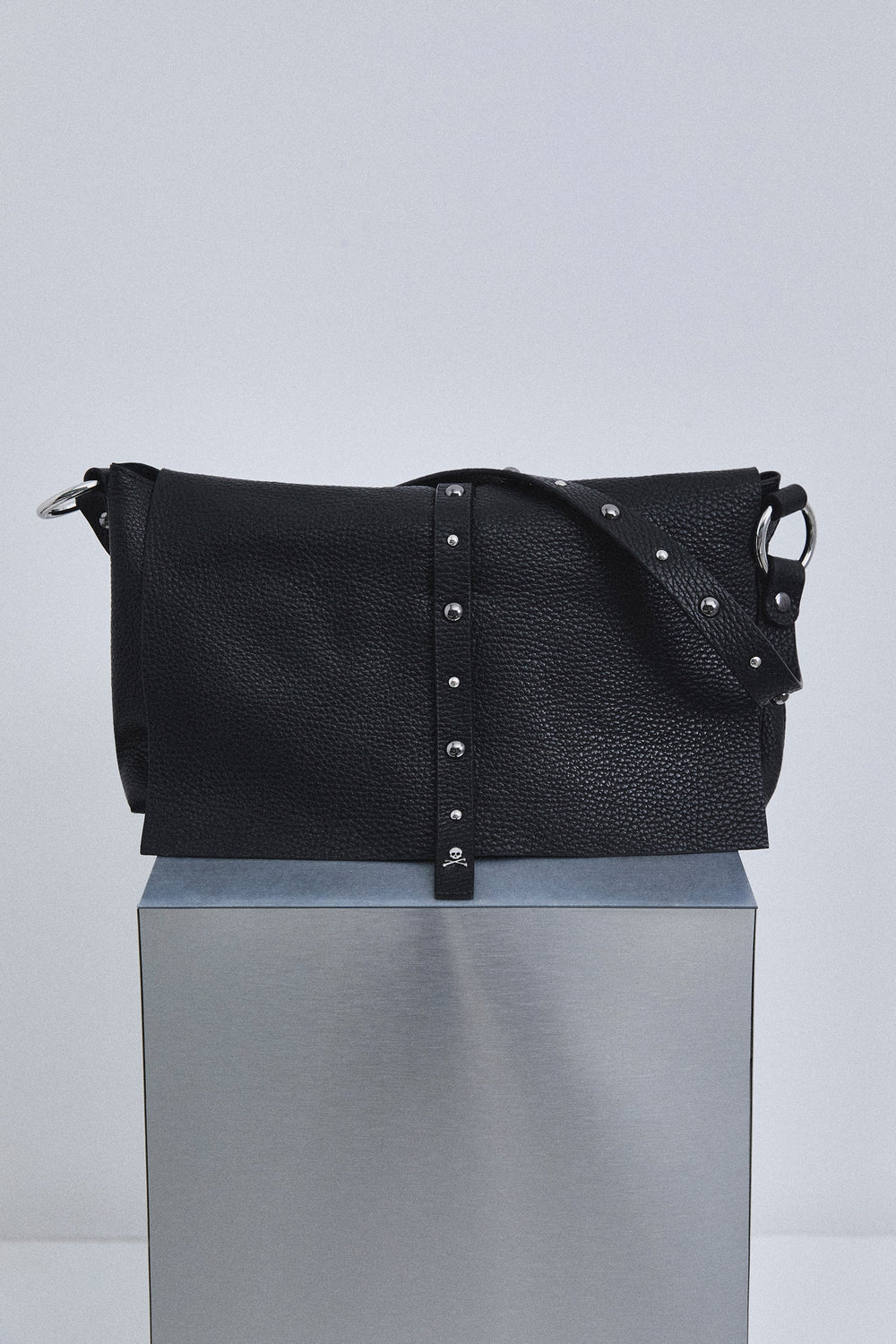 Bag made of 100% leather with stud details. Closing placket. Short handle and long strap.
