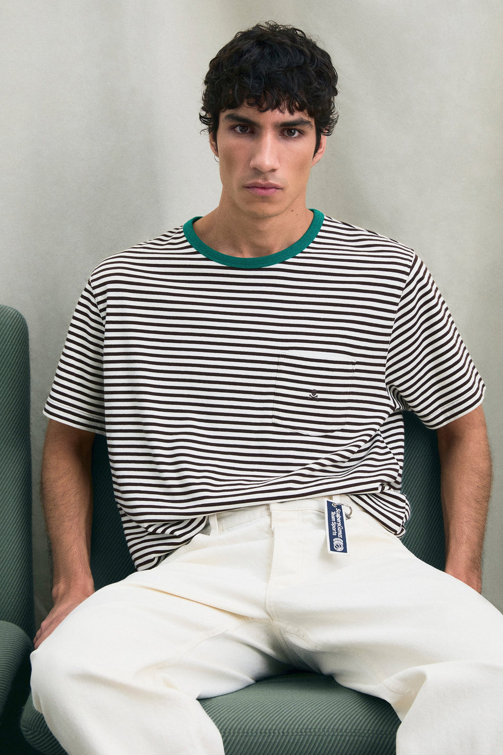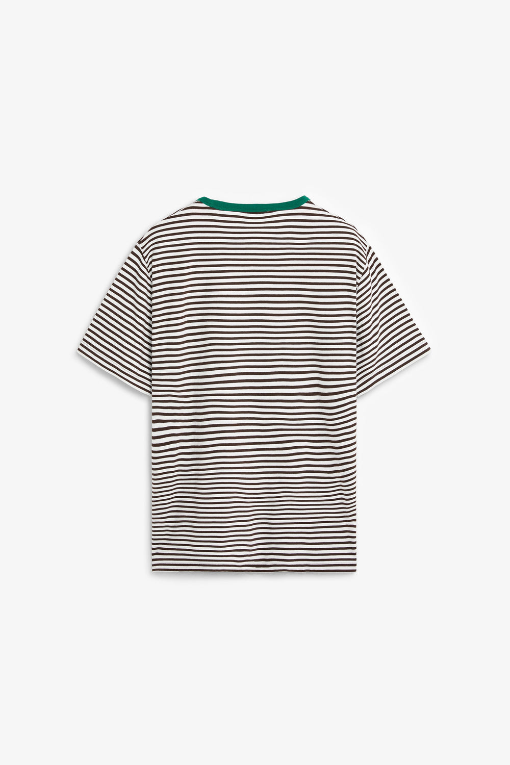 T-shirt made of 100% BCI cotton. Stripe print. Short sleeve. Contrast round neck. Pocket detail on the chest. Embroidered skull.