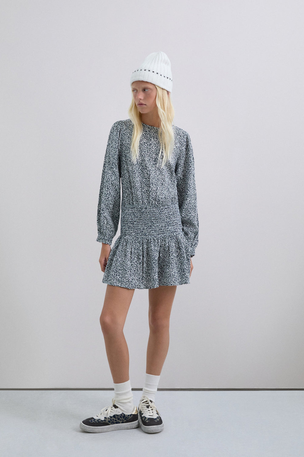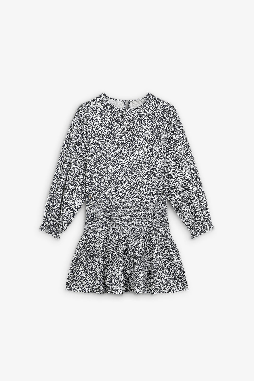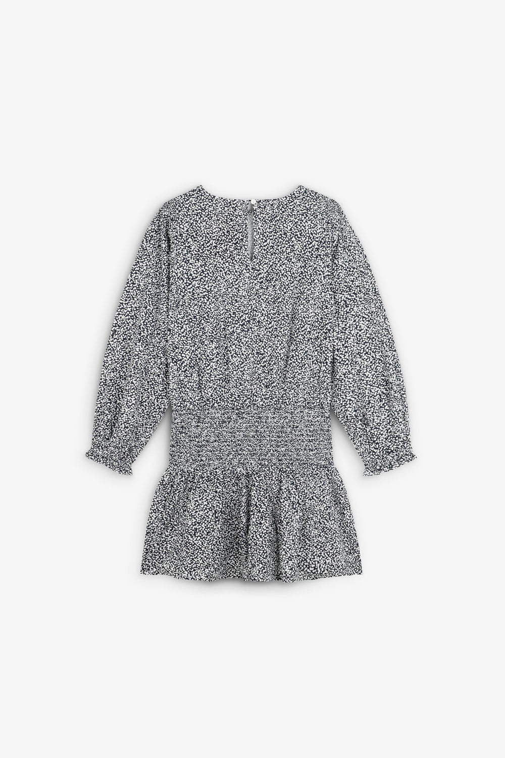Mini dress. Regular fit. Round neck. Long, slightly puffed sleeves with gathered cuffs. Smoked and skull detail on waist. Back button fastening.