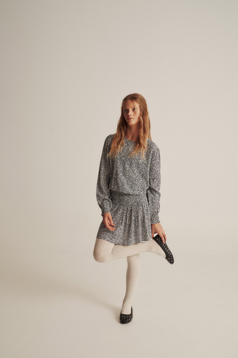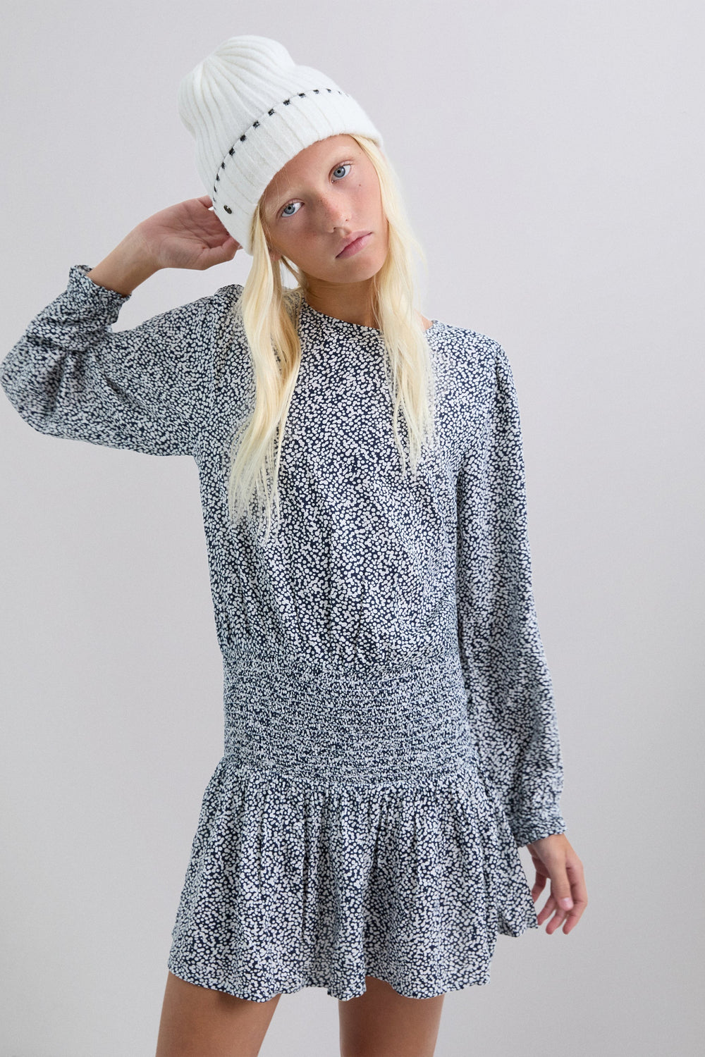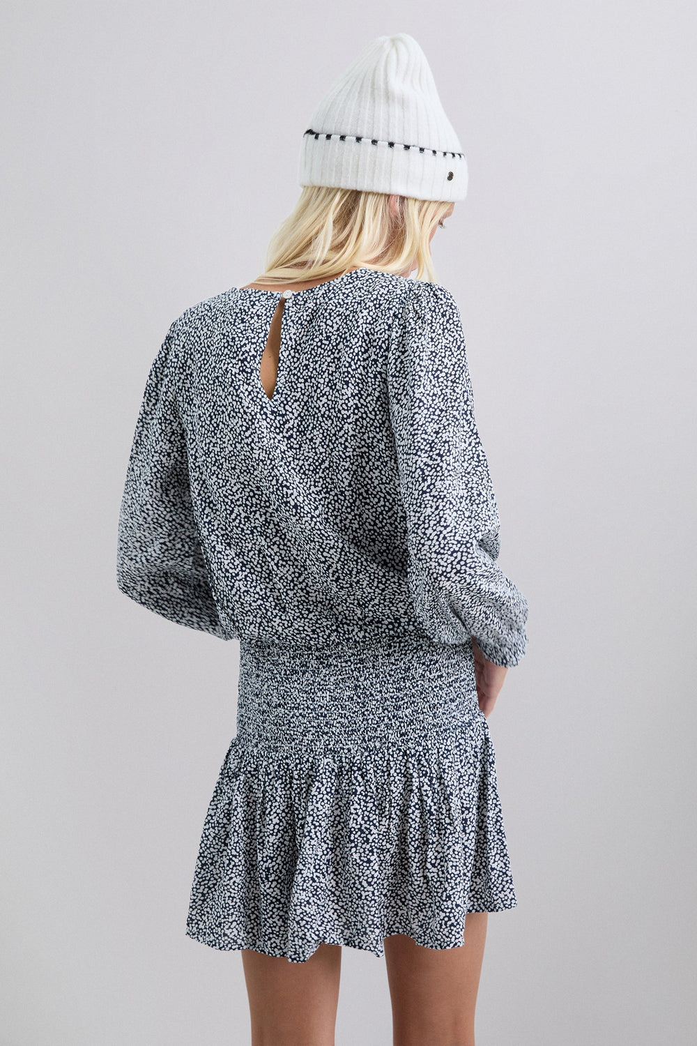 Mini dress. Regular fit. Round neck. Long, slightly puffed sleeves with gathered cuffs. Smoked and skull detail on waist. Back button fastening.