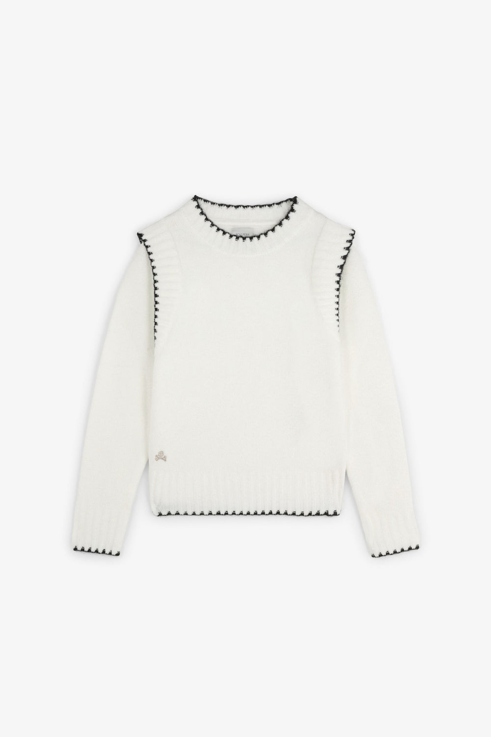 Knit sweater. Round neck. Long sleeves. Contrast embroidered skull detail. Ribbed trim.