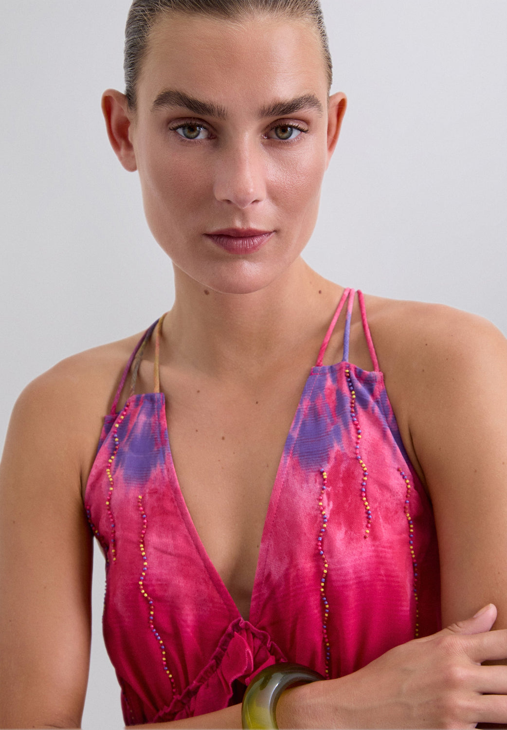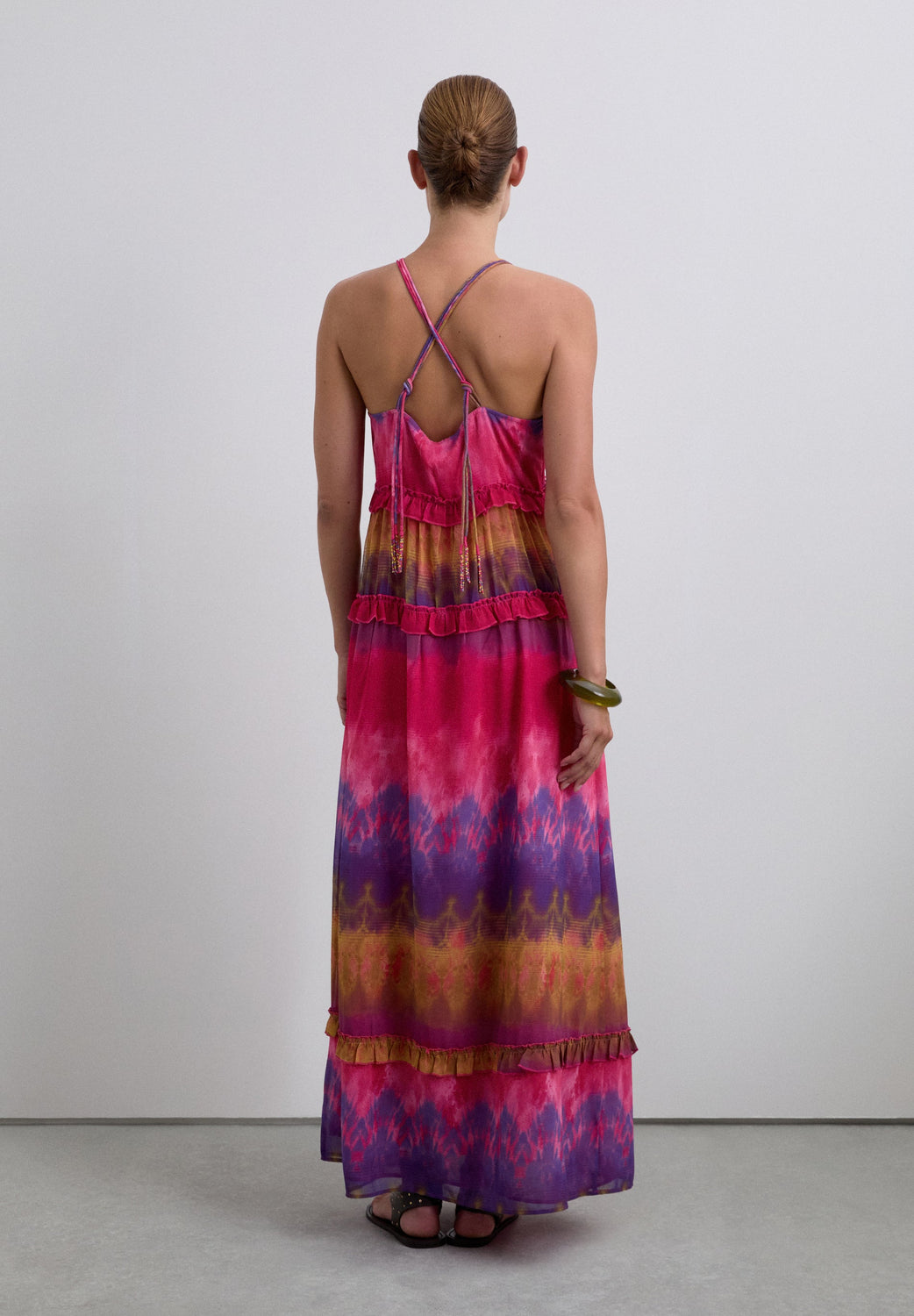 Long dress made of flowing fabric. V-neck with tie-dye print and ruffle details. Hanging ribbons with coloured beads on collar and waist.