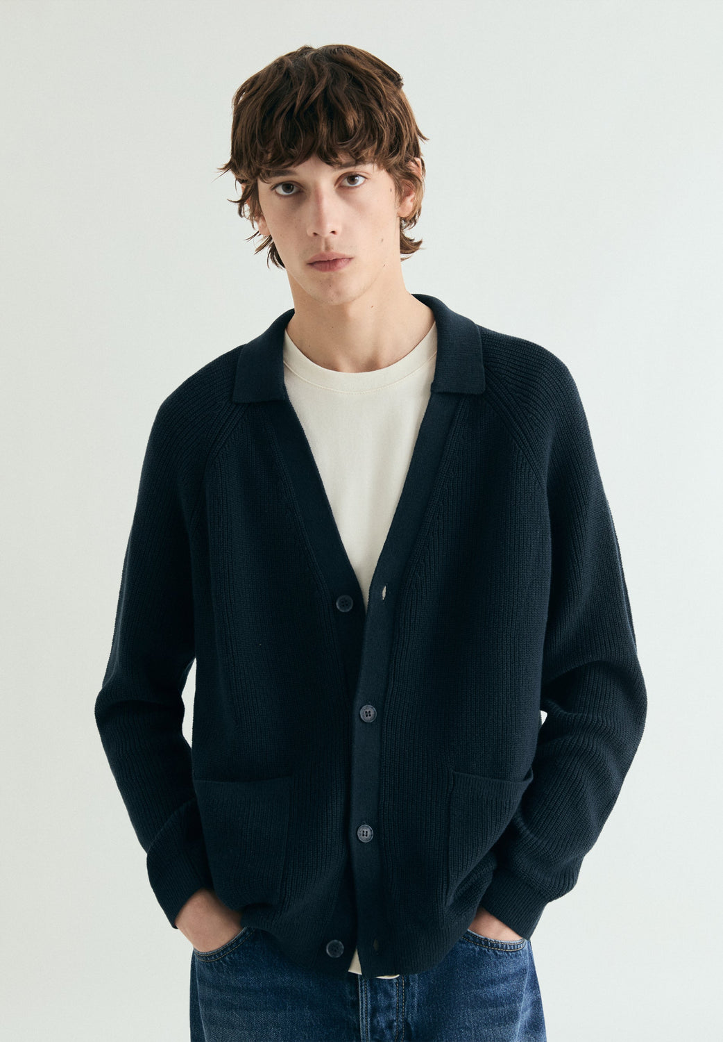 Cardigan made of a cotton and linen blend. Raglan sleeves. Polo shirt collar. Patch pockets. Front button fastening.