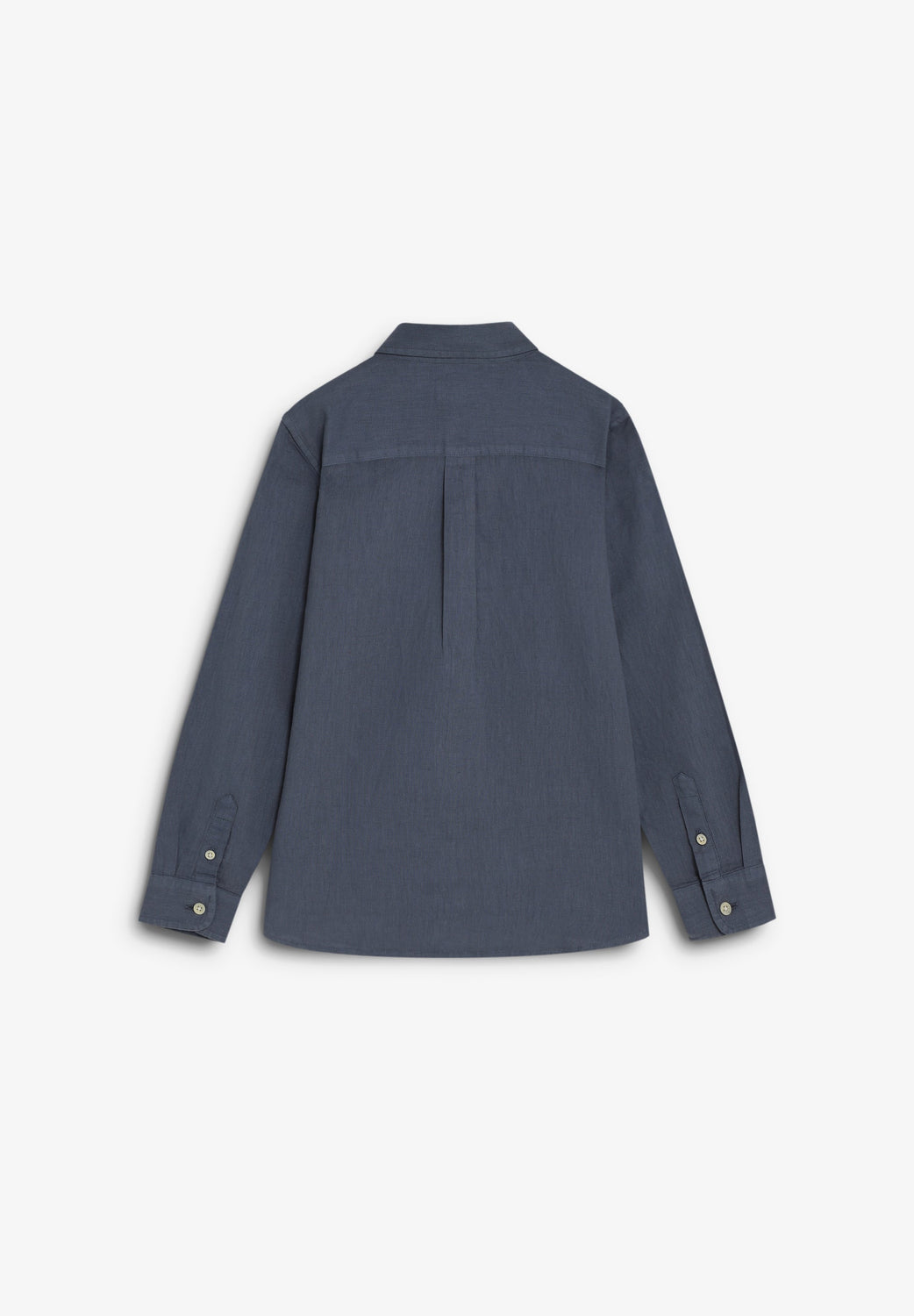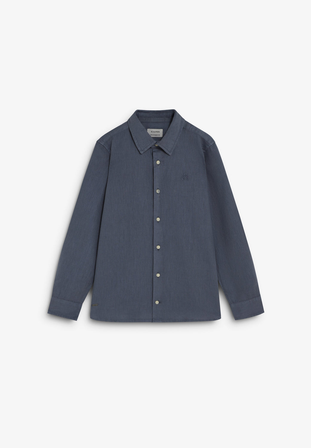 Made of a BCI cotton and linen blend. Classic collar and front button fastening. Matching embroidered skull on the chest. Regular fit with buttoned cuffs. Metal tag detail with logo at the bottom.