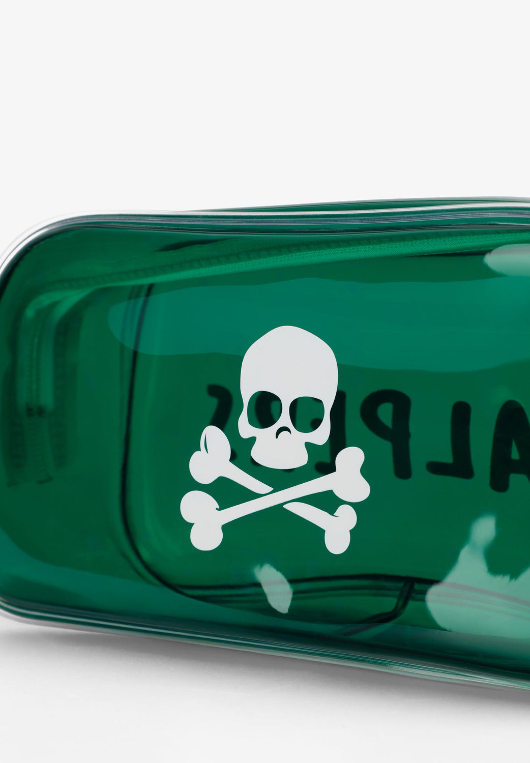 Transparent toiletry bag with zip fastening. Side print with skull and logo. Includes transparent bottles for liquids.