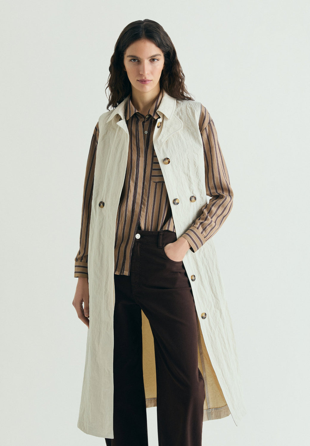 Trench coat made of lightweight fluid material. Regular fit. Classic collar and button fastening. Long detachable sleeves.