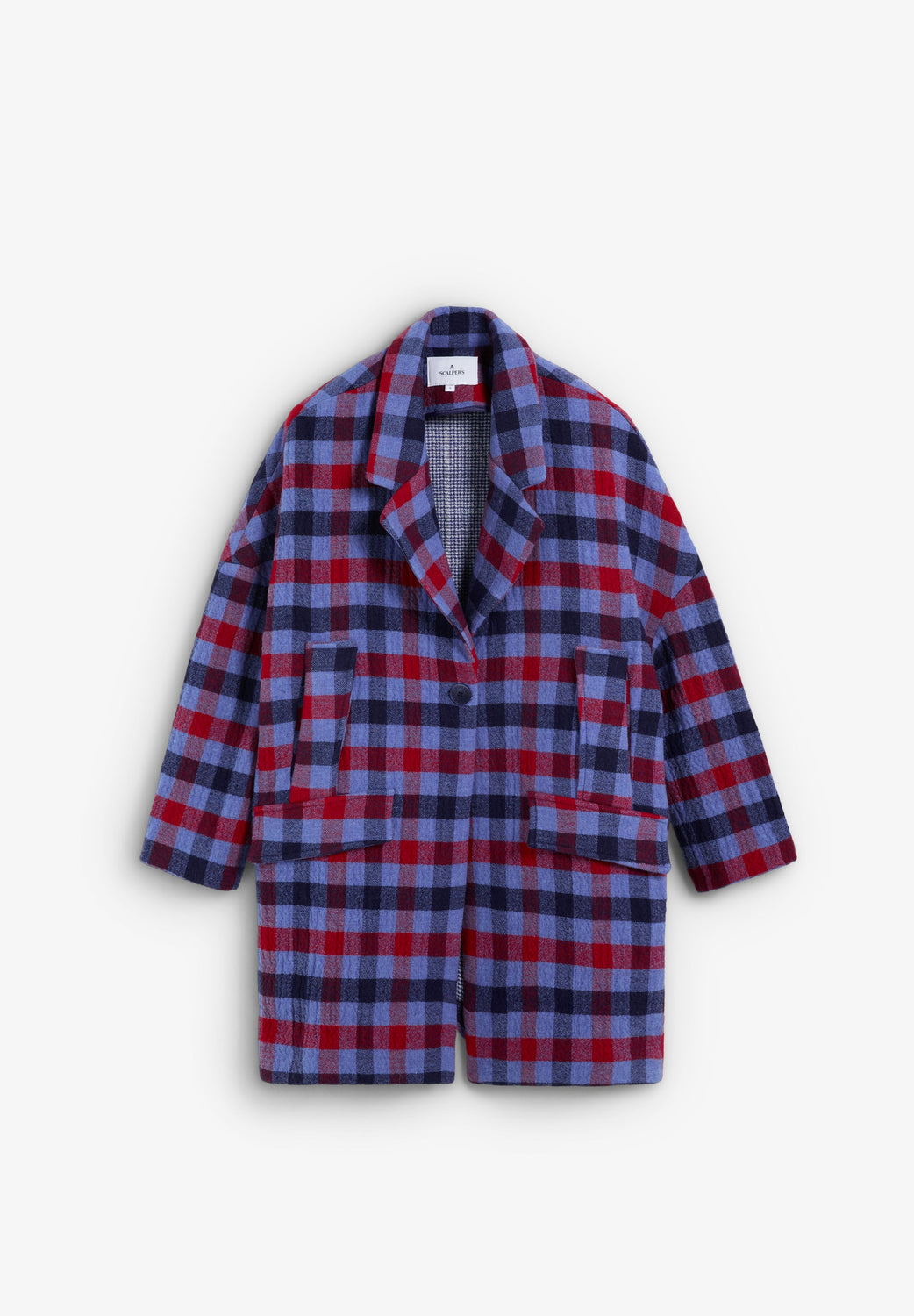 Checked cloth coat. Made of cotton and wool blend. Slightly oversize design. Lapel collar. Snap button fastening. Long sleeves. Jetted flap pockets.