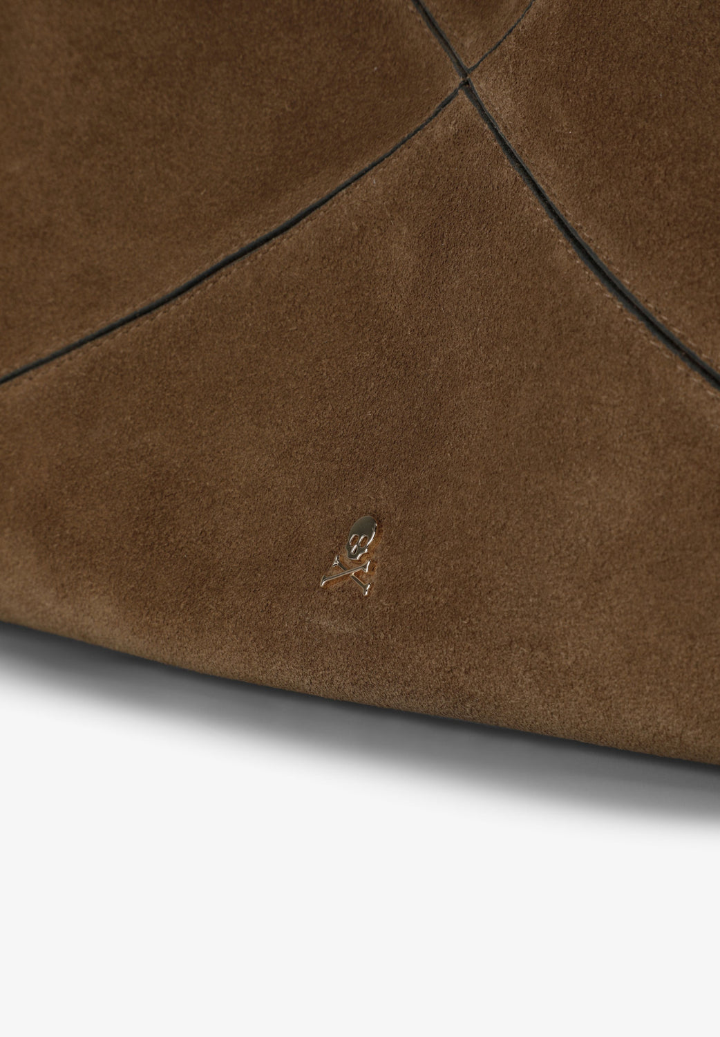 Tote bag made of 100% split suede. Double shoulder strap. Double fastening with lobster clasp and magnetic button on the sides. Metallic skull on front.