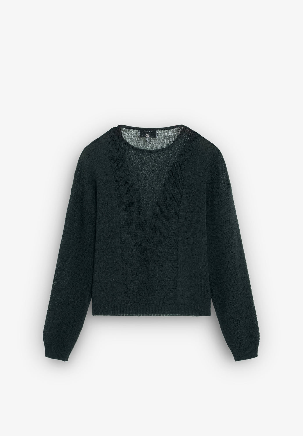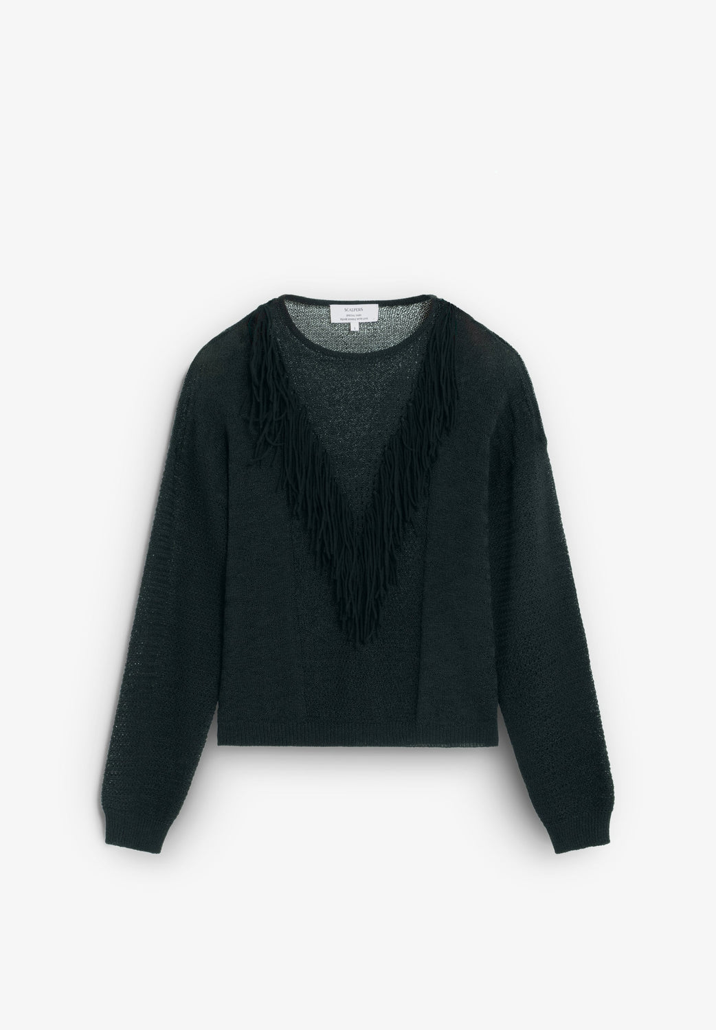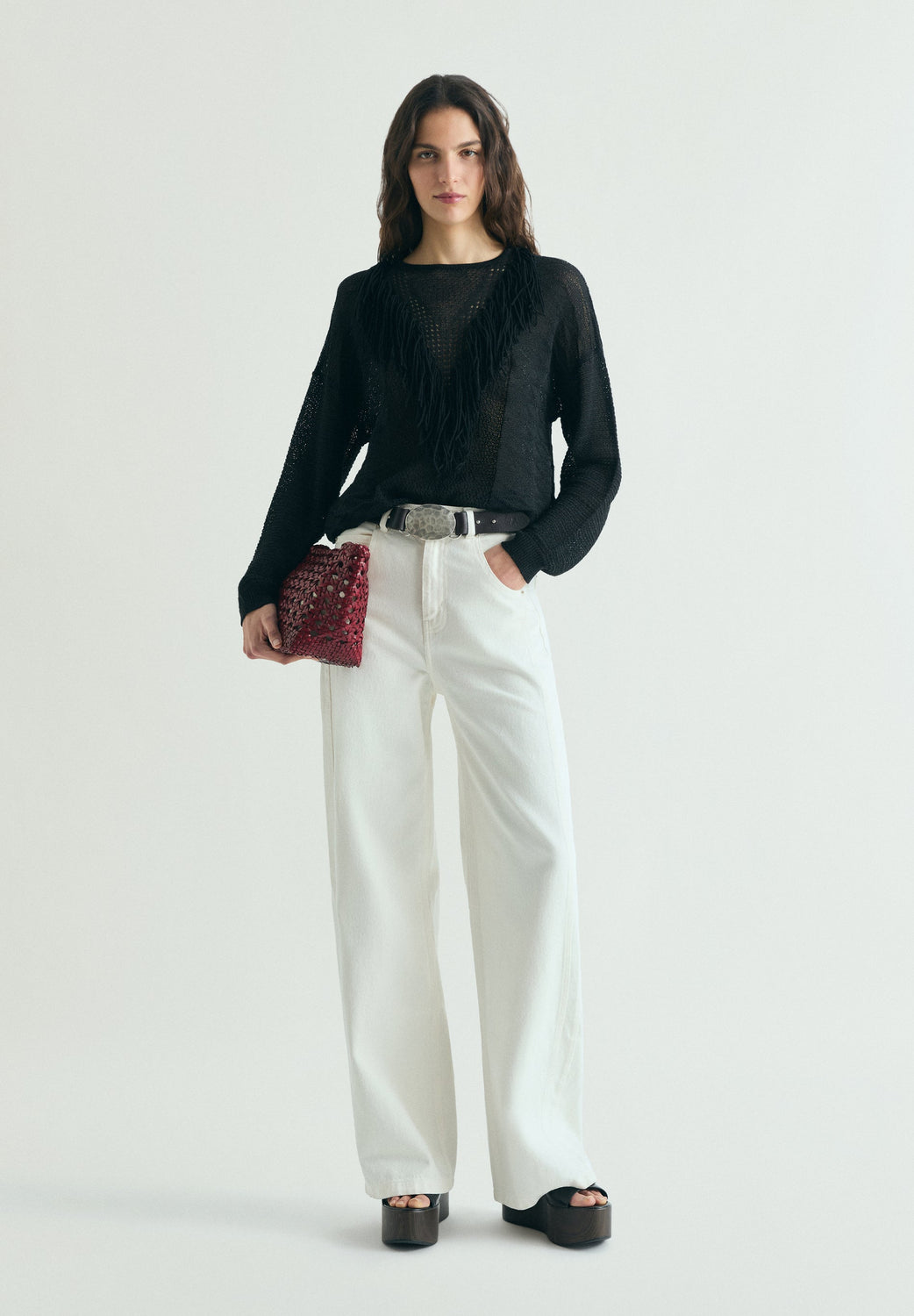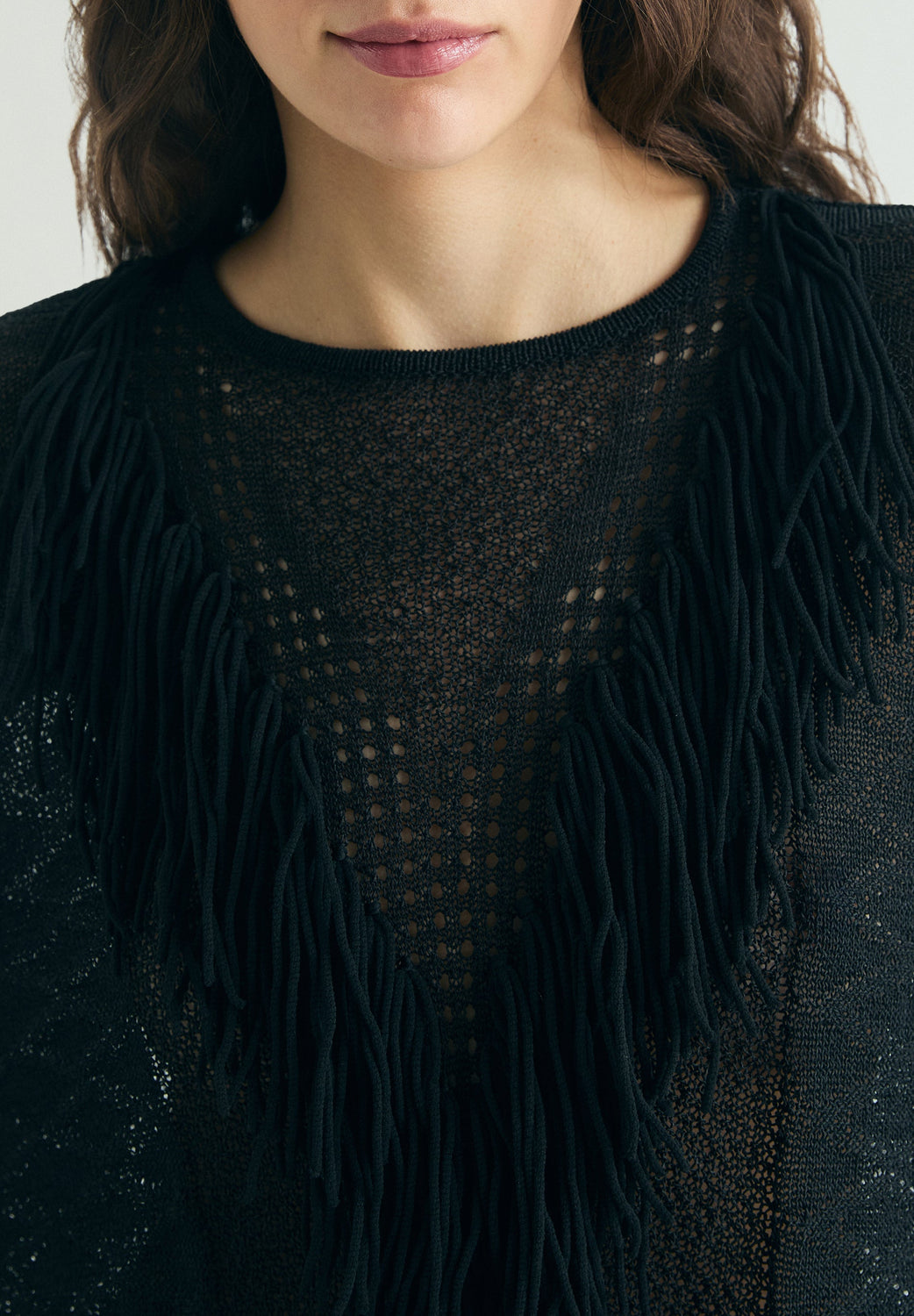 Knit sweater with openwork texture made of a cotton blend. Fringed detailing at the front. Round neck with long sleeves. Ribbed trim. Metal appliqué detail with skull on back.
