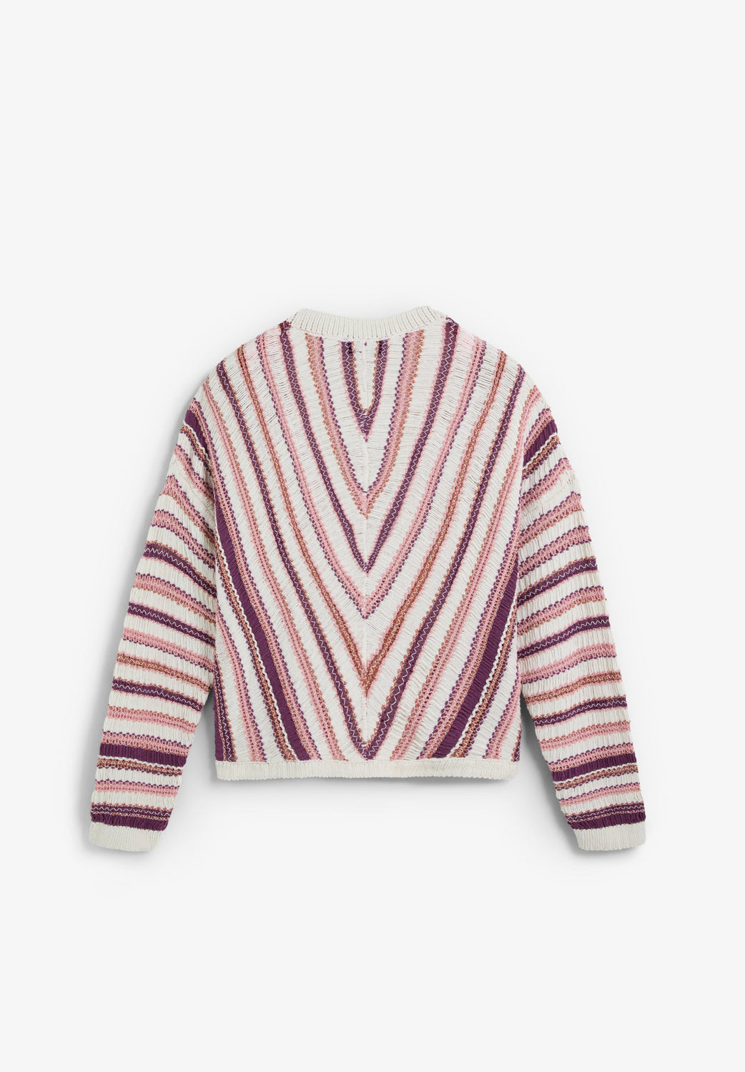 V-neck knit sweater with long sleeves. Diagonal stripe design. Ribbed trim on collar, cuffs and hem.