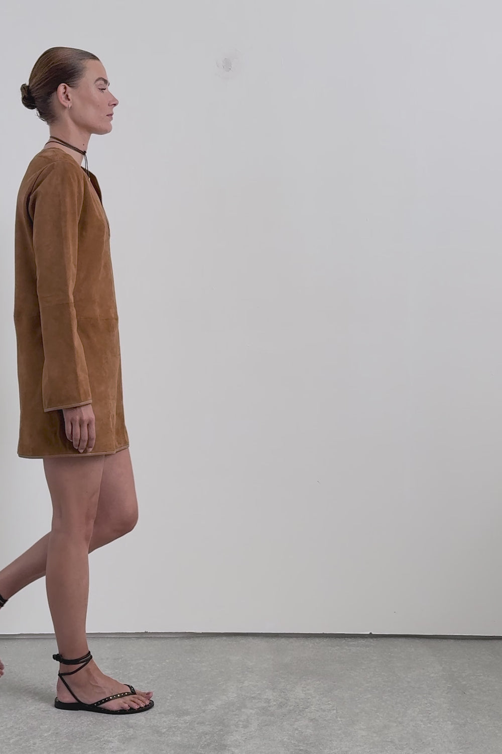 Mini dress made in goatskin with suede finish. Crew neck. Slightly flared long sleeves. Piping and stitching details around the neckline, sleeves and hem.