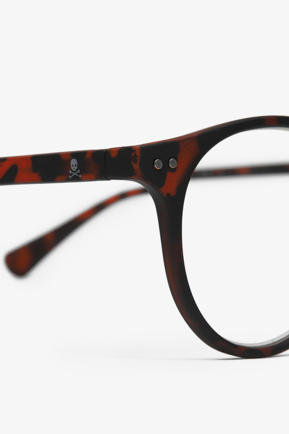 Round resin sunglasses made of polycarbonate. Prescription lenses and skull detail on the side.
