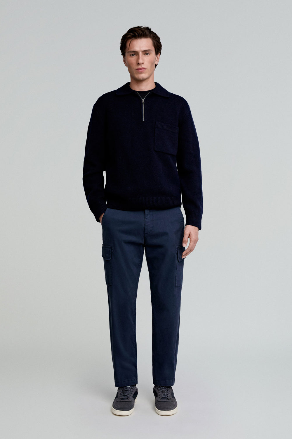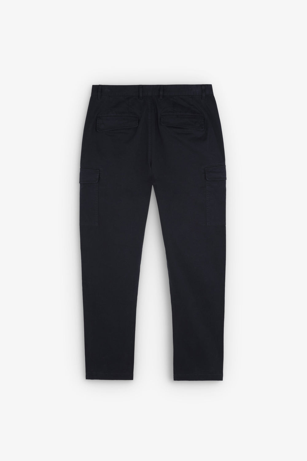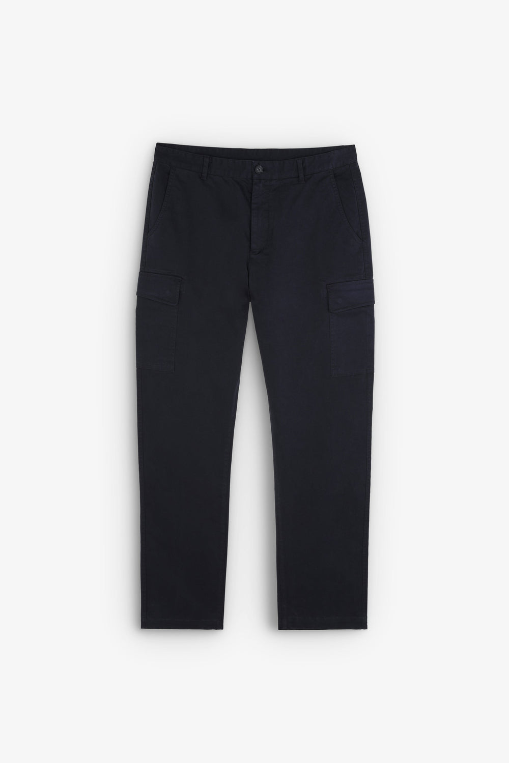 Cargo trousers made of slightly stretch fabric. Slim fit, zip and button fastening. Leg pockets with snap button flaps and back pockets. Belt loops at the waist.