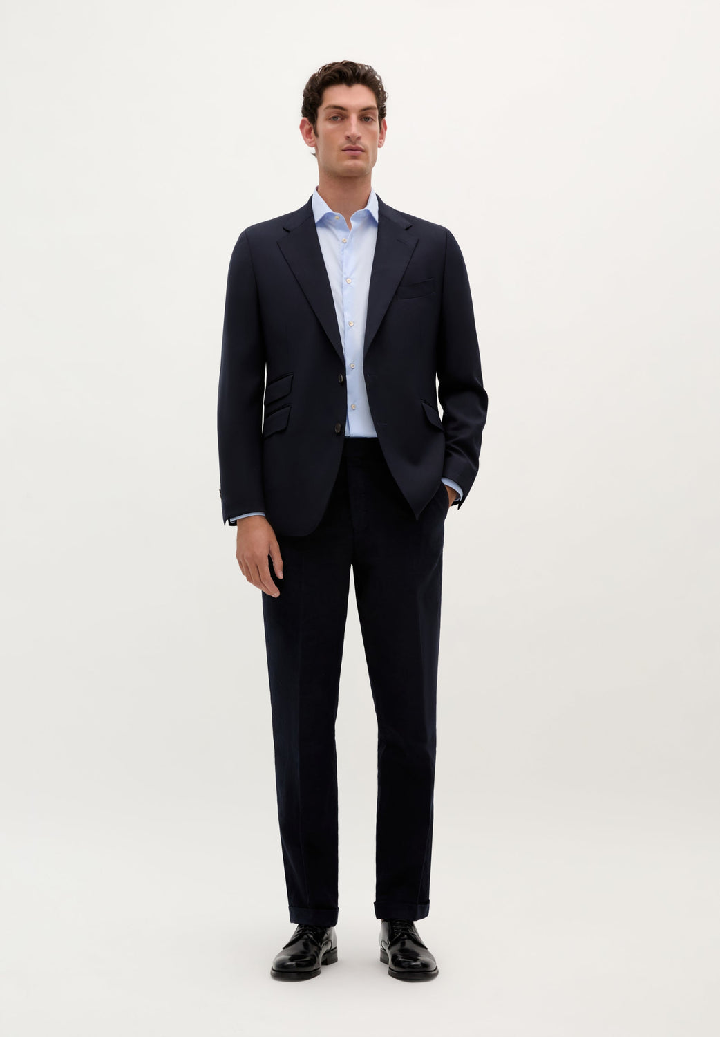 Jacket made of 100% wool. Single button fastening. Notched lapels. Chest welt pocket, side flap pockets. Back vent.