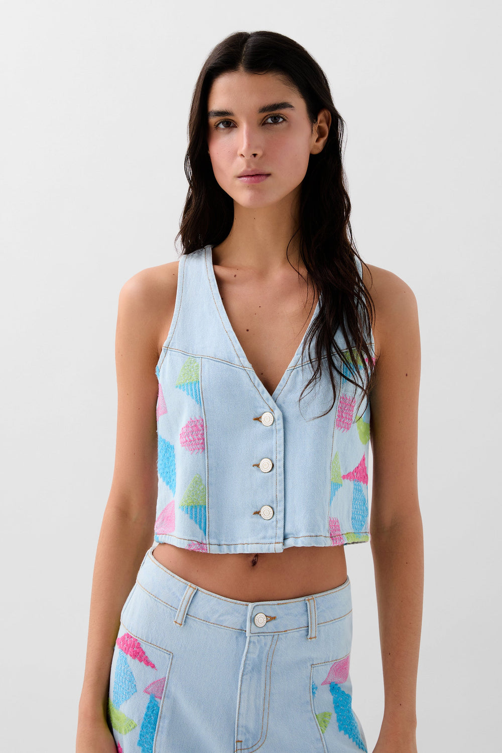 Denim waistcoat made of 100% cotton with embroidered three-coloured details. Regular fit, V-neck sleeveless design with button fastening.