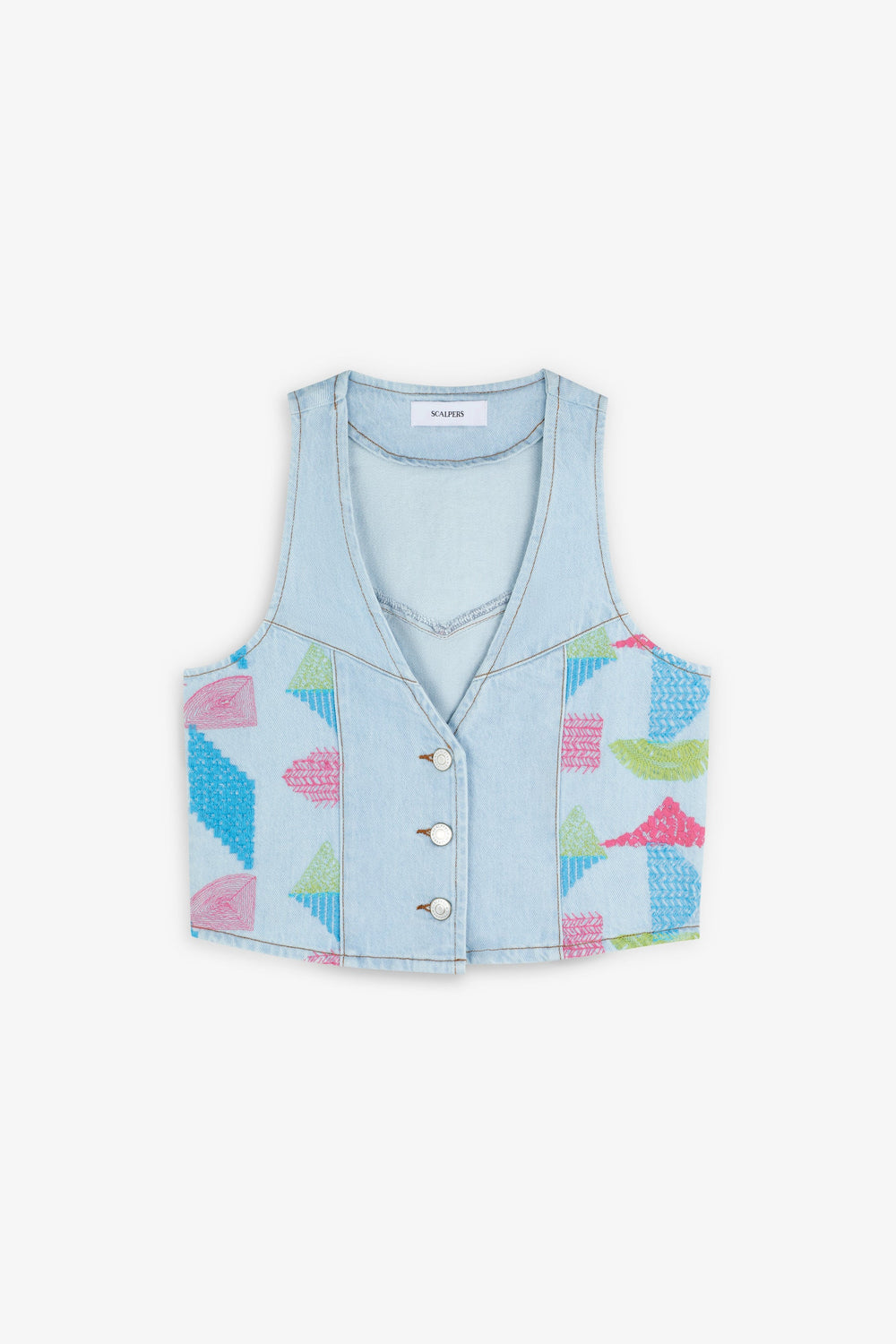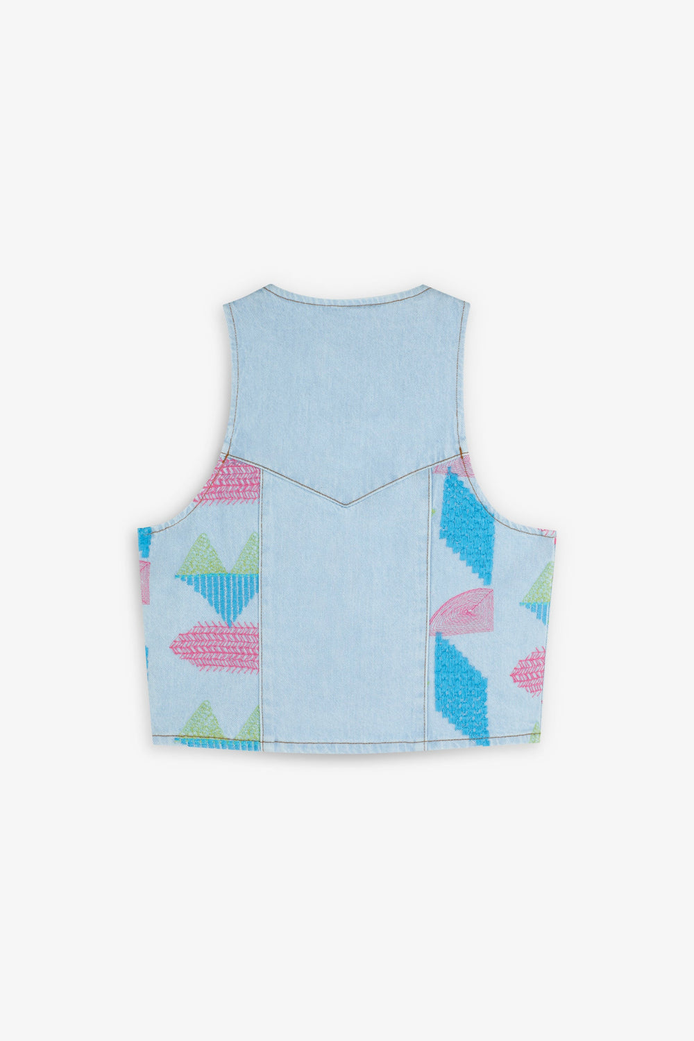 THREE-COLOURED EMBROIDERED DENIM WAISTCOAT