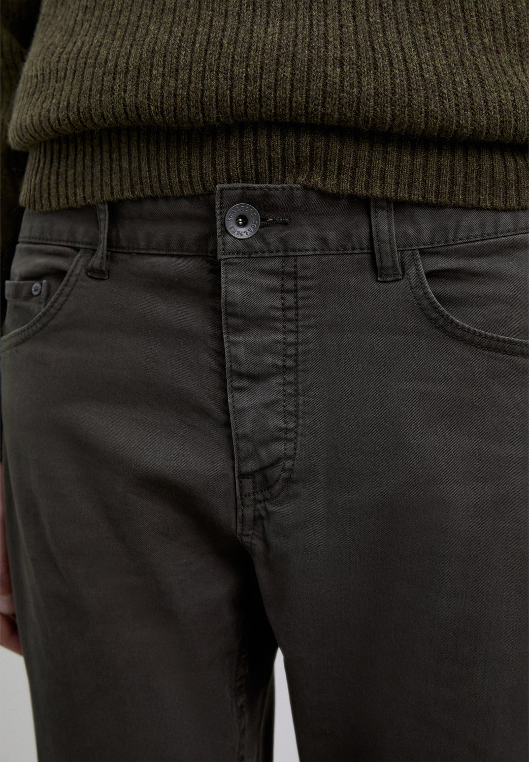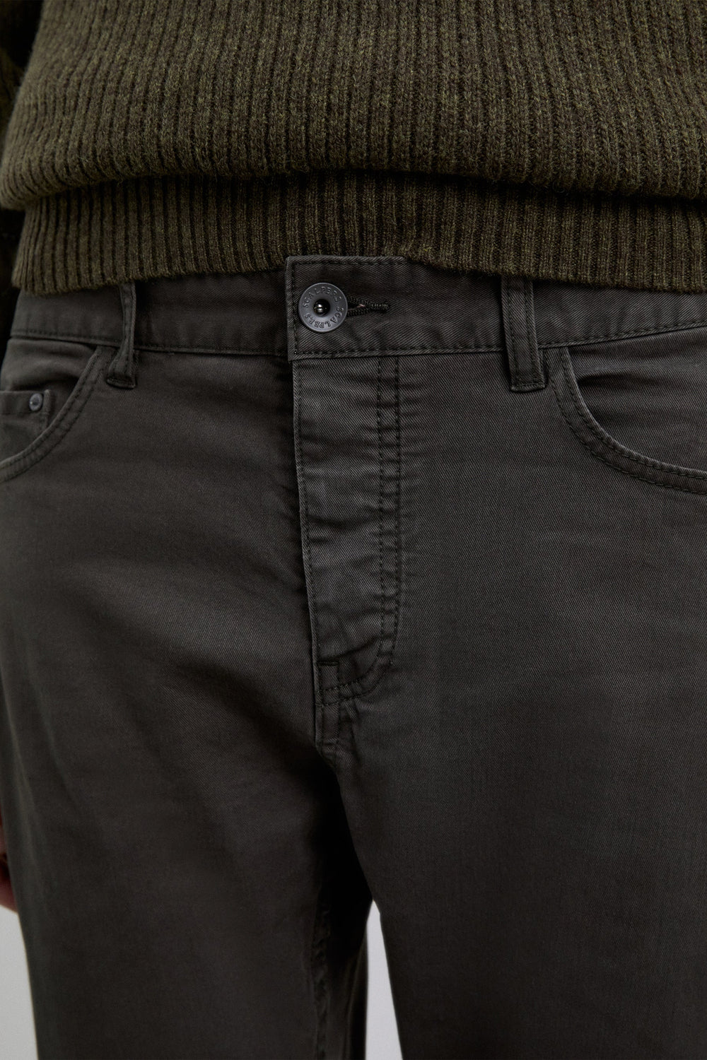 Trousers made of a cotton blend. Slightly stretchy. Button fastening. Regular fit. Back and side pockets. Belt loops.