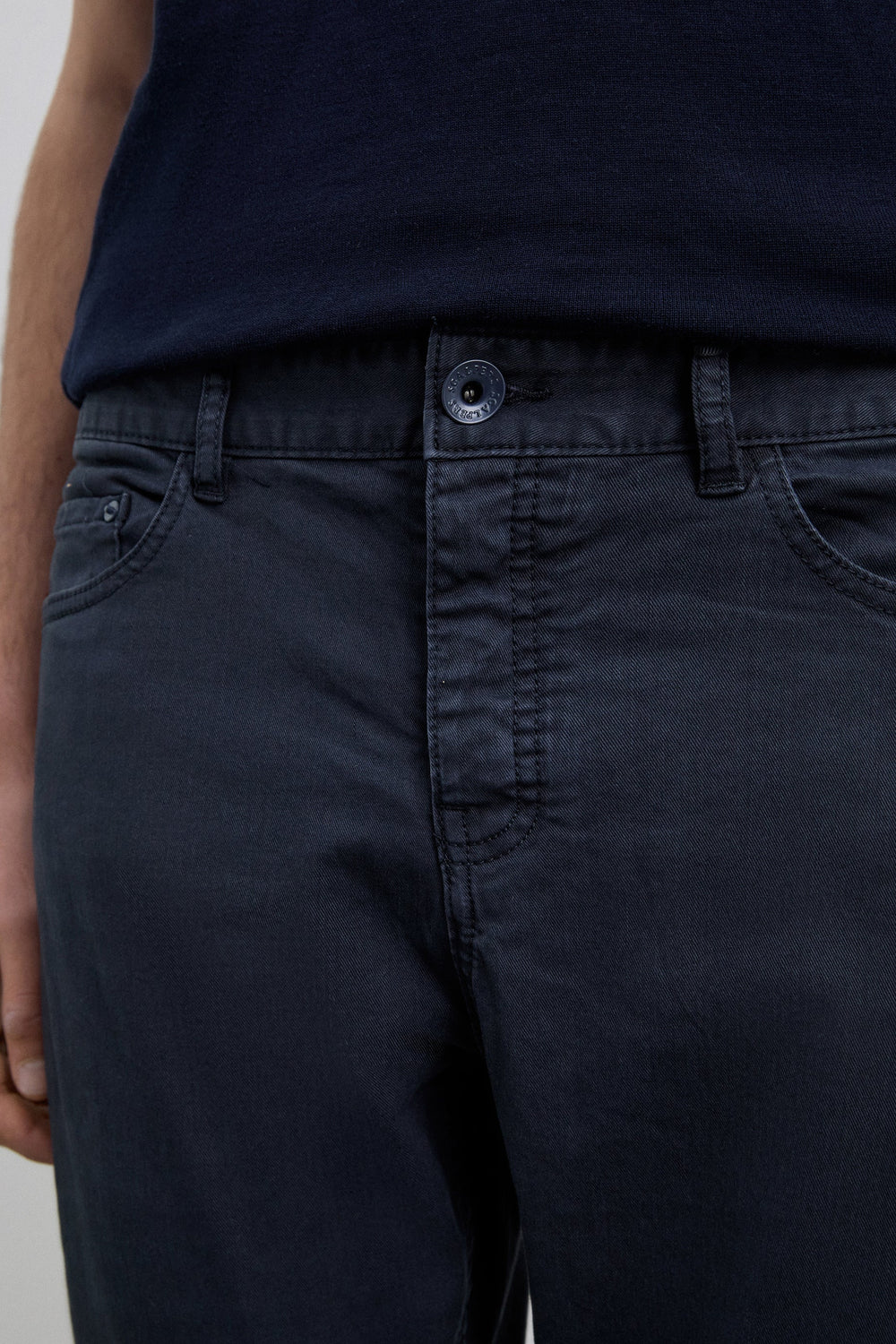 Trousers made of a cotton blend. Slightly stretchy. Button fastening. Regular fit. Back and side pockets. Belt loops.