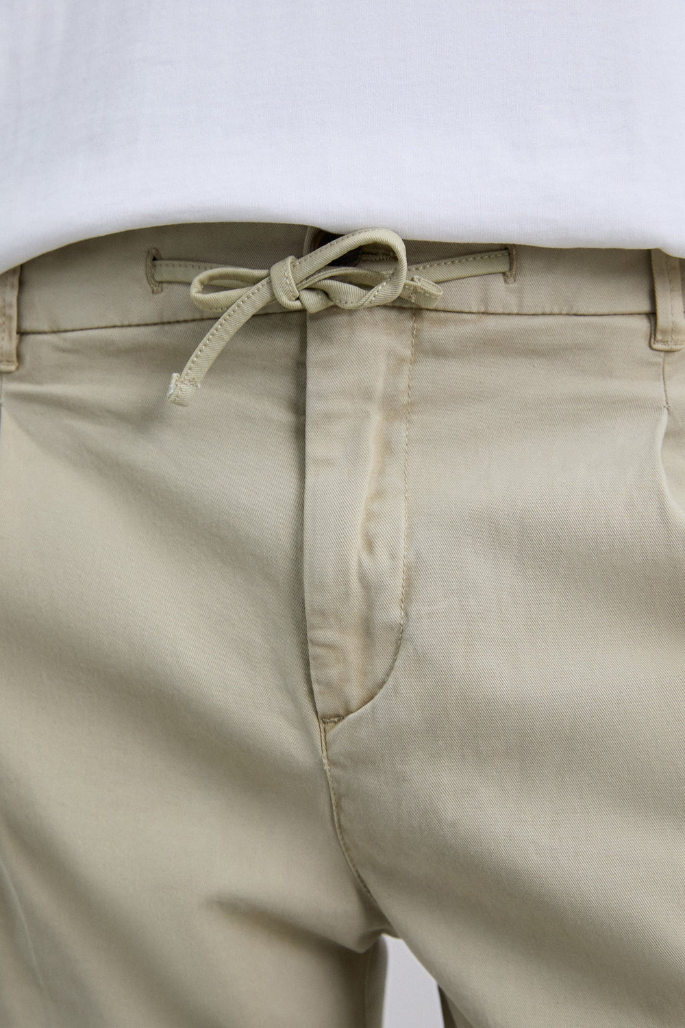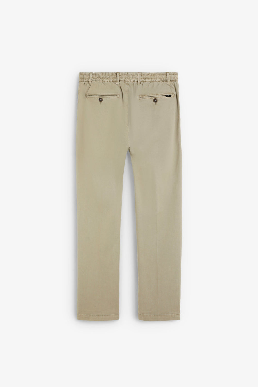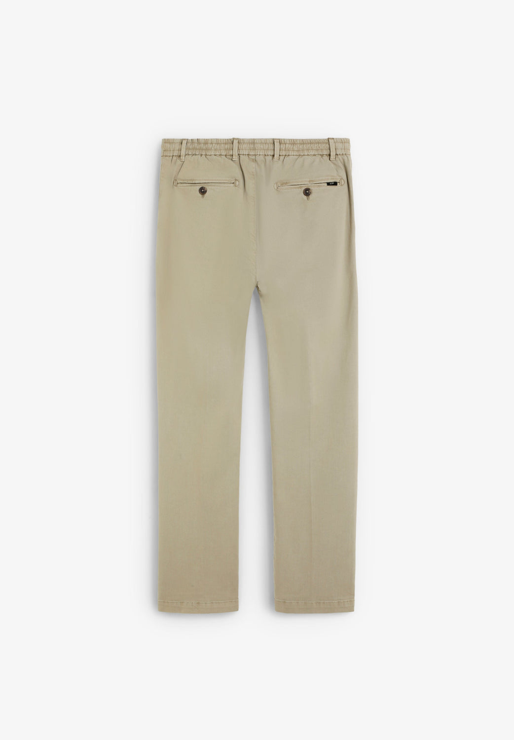 Trousers made of BCI cotton. Relaxed fit Adjustable fastening with drawstring and button at the waist. Two side pockets, back pockets with button fastening and front pleats. Belt loops at the waist.