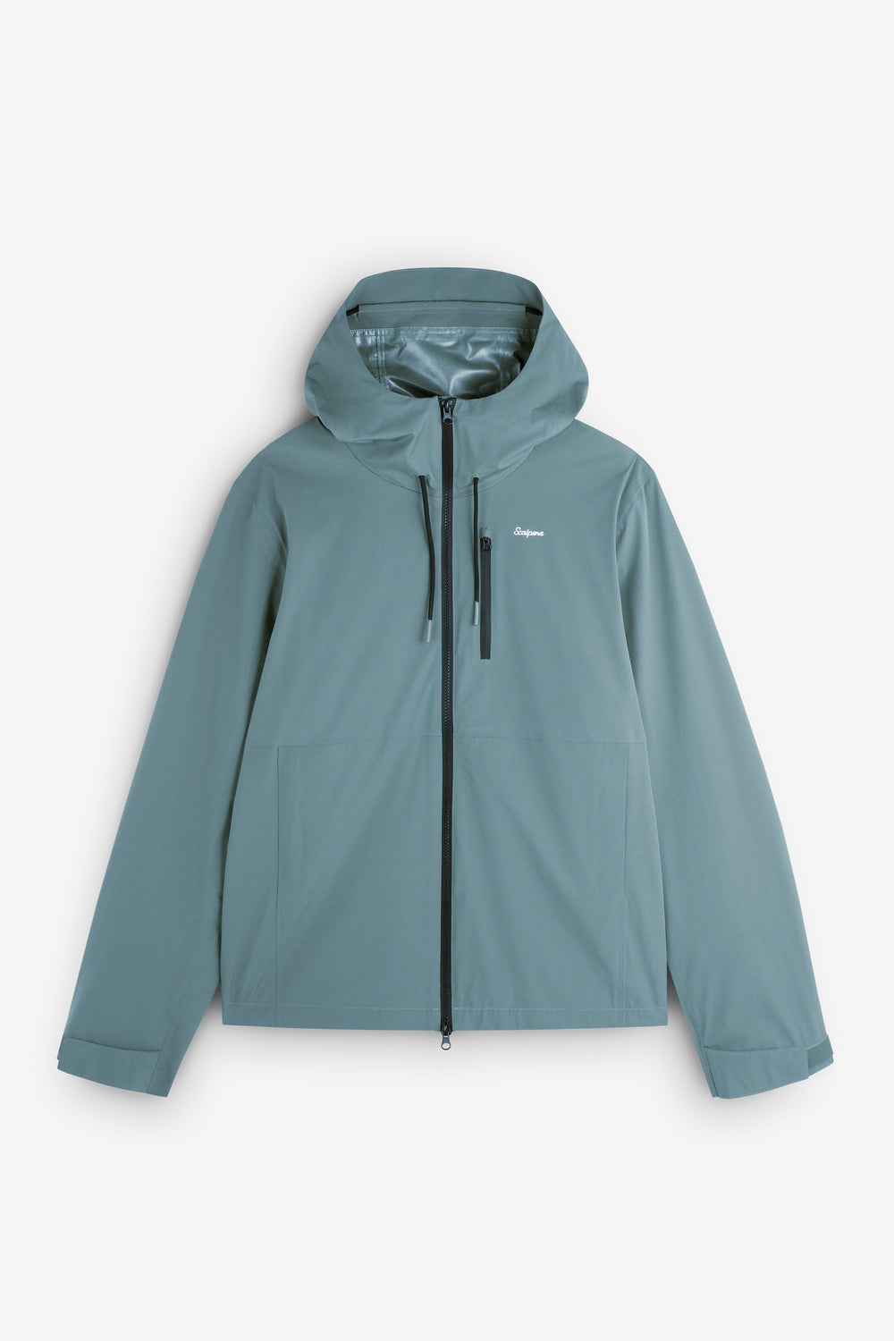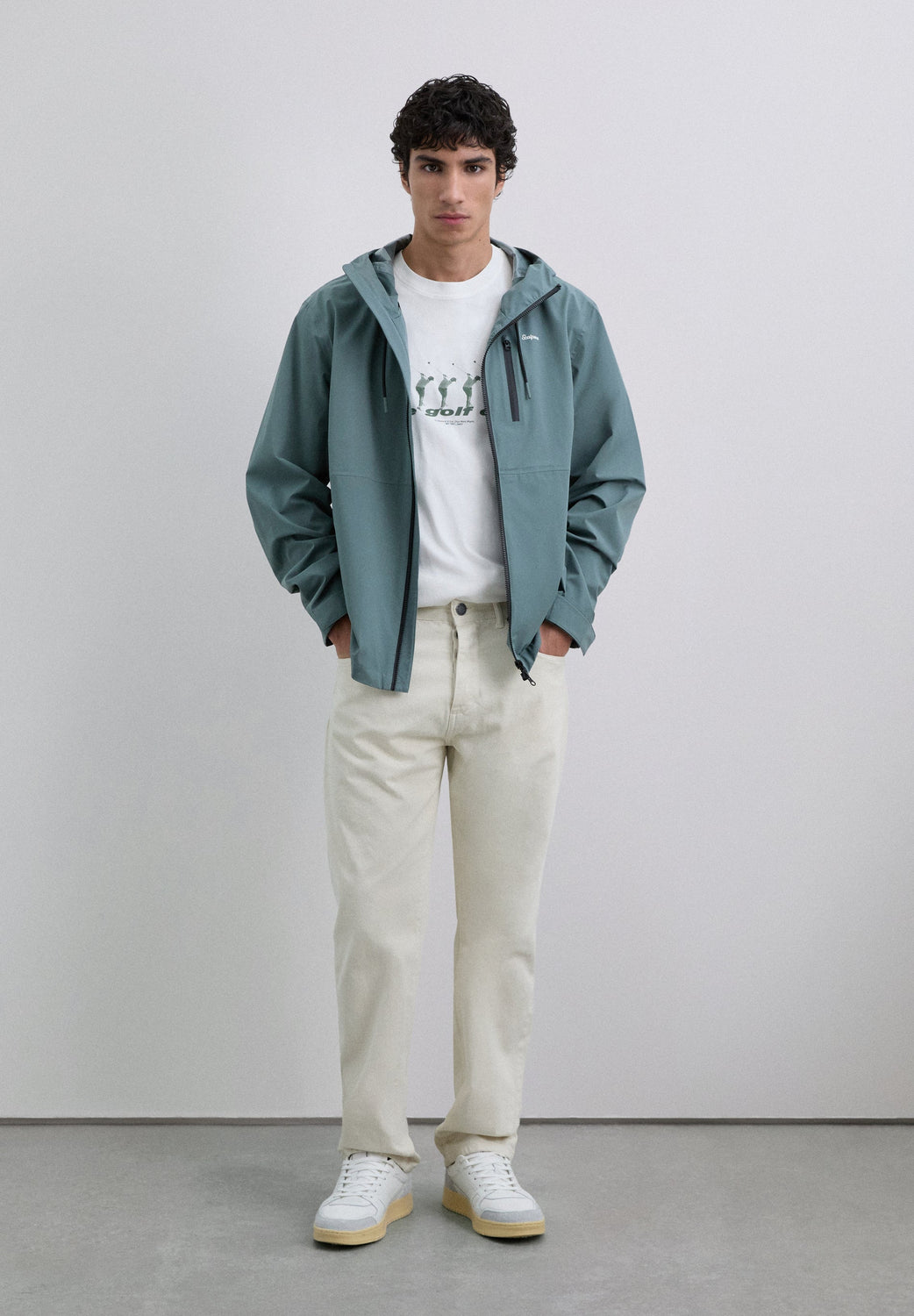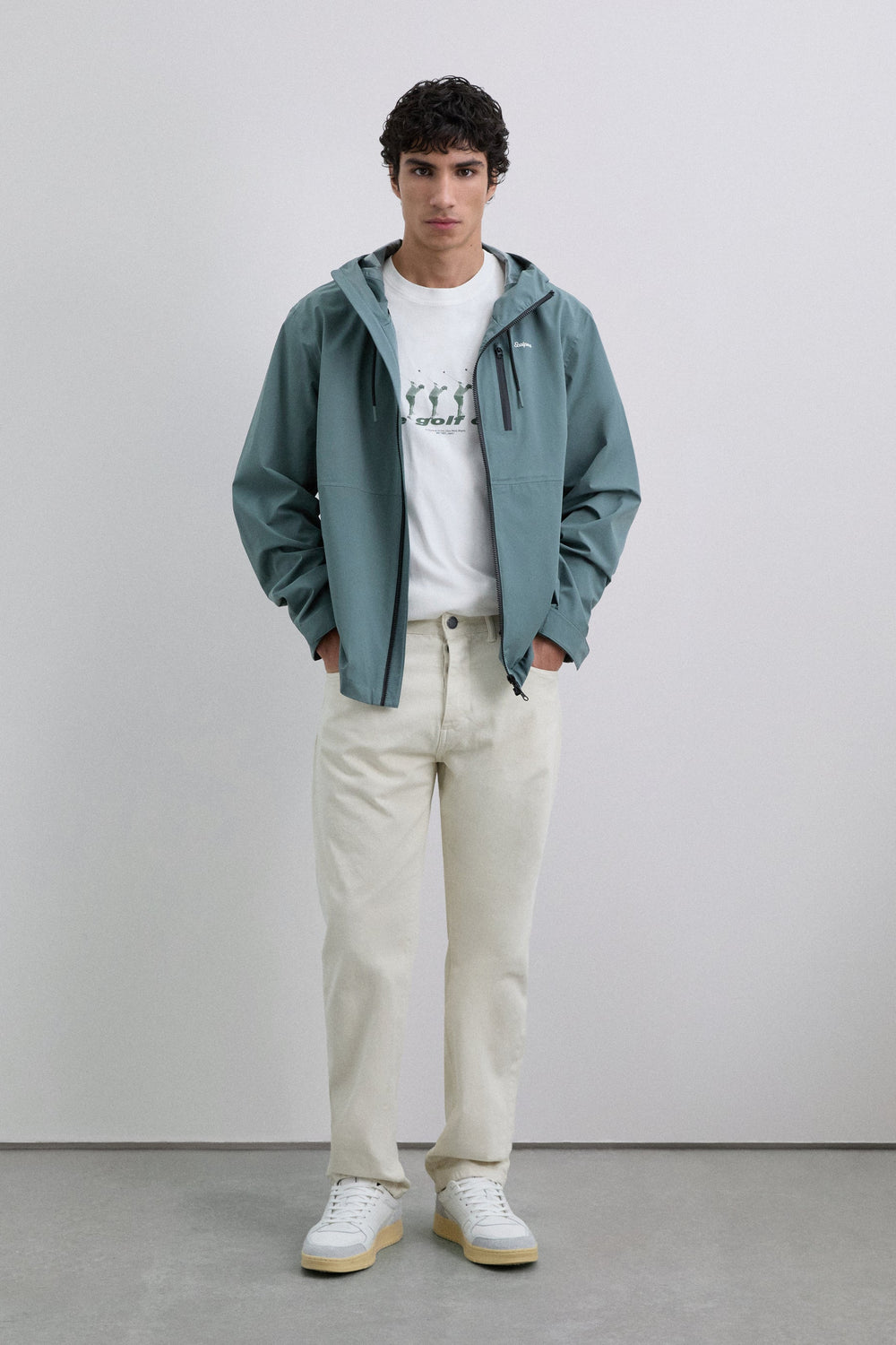 Waterproof jacket featuring an adjustable hood with drawstring. Heat-sealed zip fastening. Long sleeves. Chest pocket with heat-sealed zip and side flap pockets with snap closure. Contrast logo detail on the front and skull motif on the back of the hood.