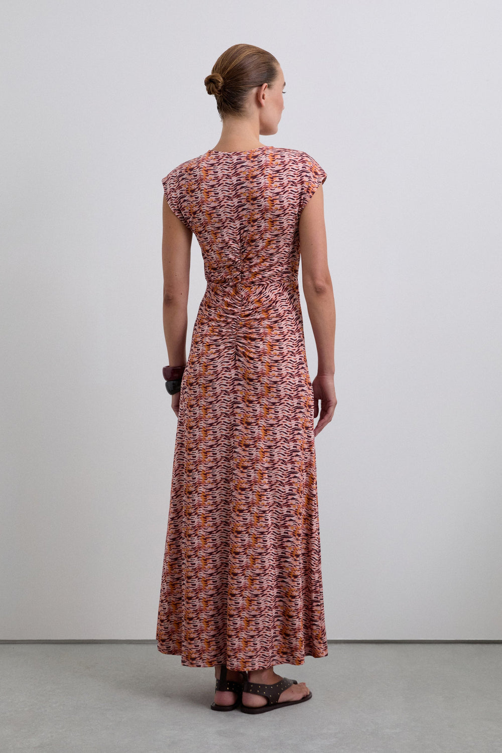 Flowing printed dress with cut out at the chest. Short sleeve. V-neck. Adjustable front bow detail.