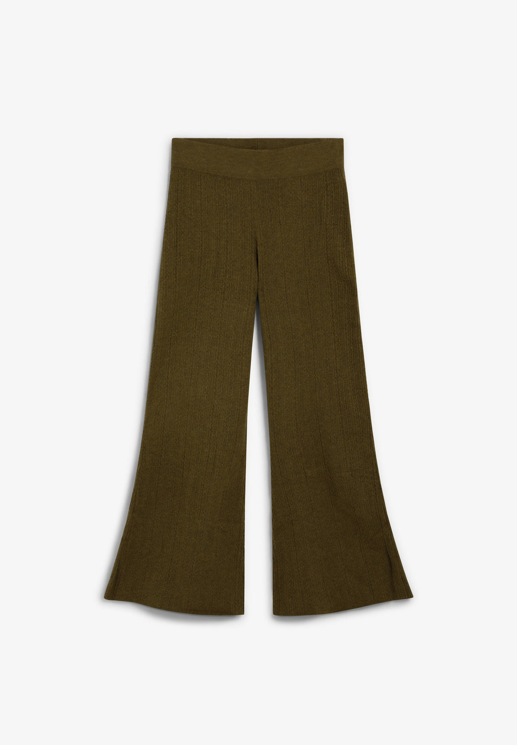 Trousers made of a cotton and wool blend. Fine cable knit texture. Flowing fabric with elastic waistband for snug fit. Long bell-bottom trousers.
