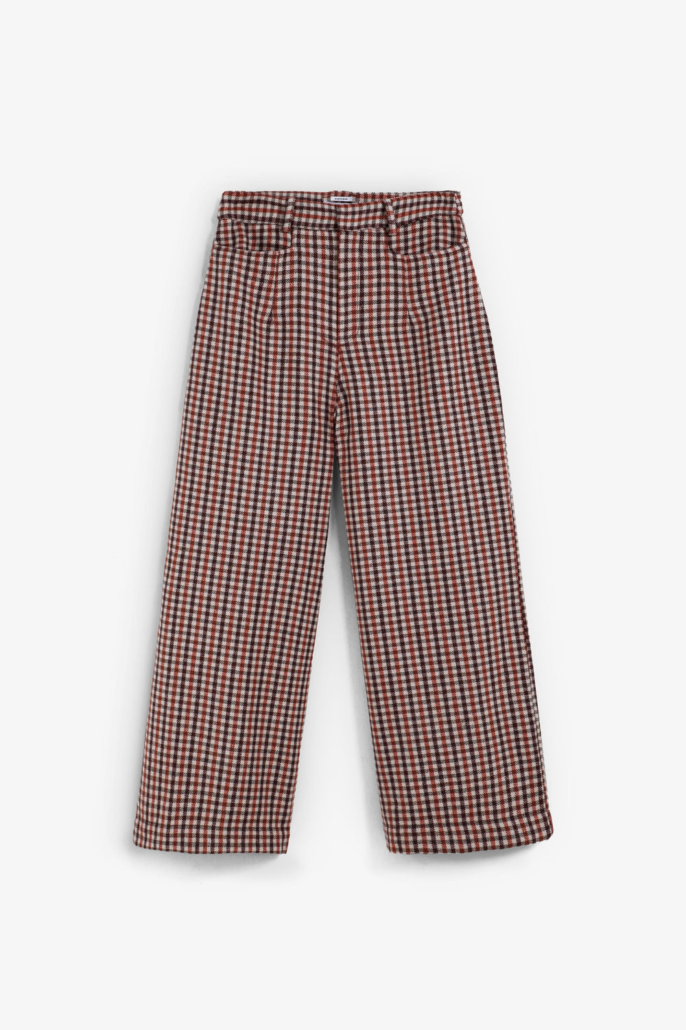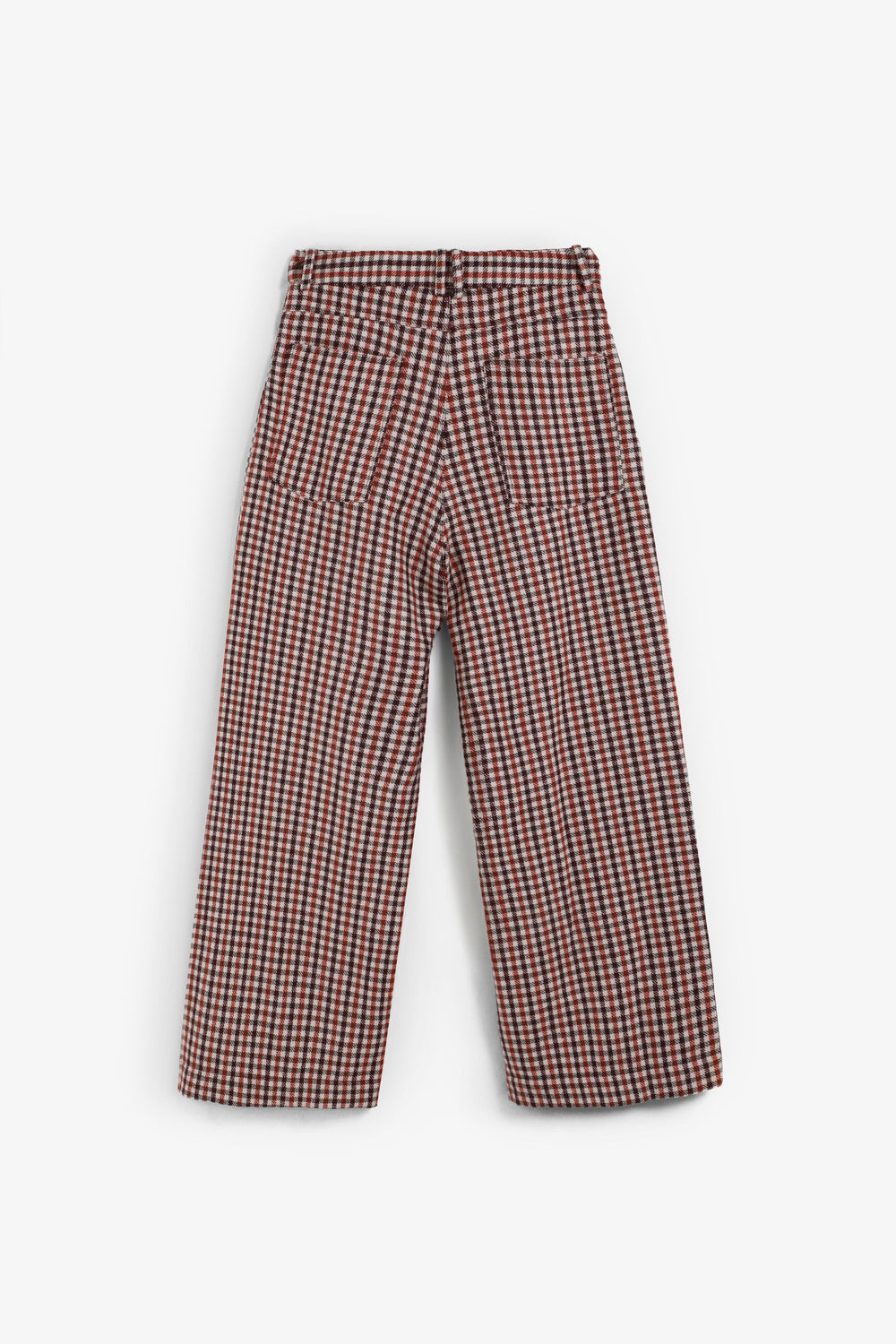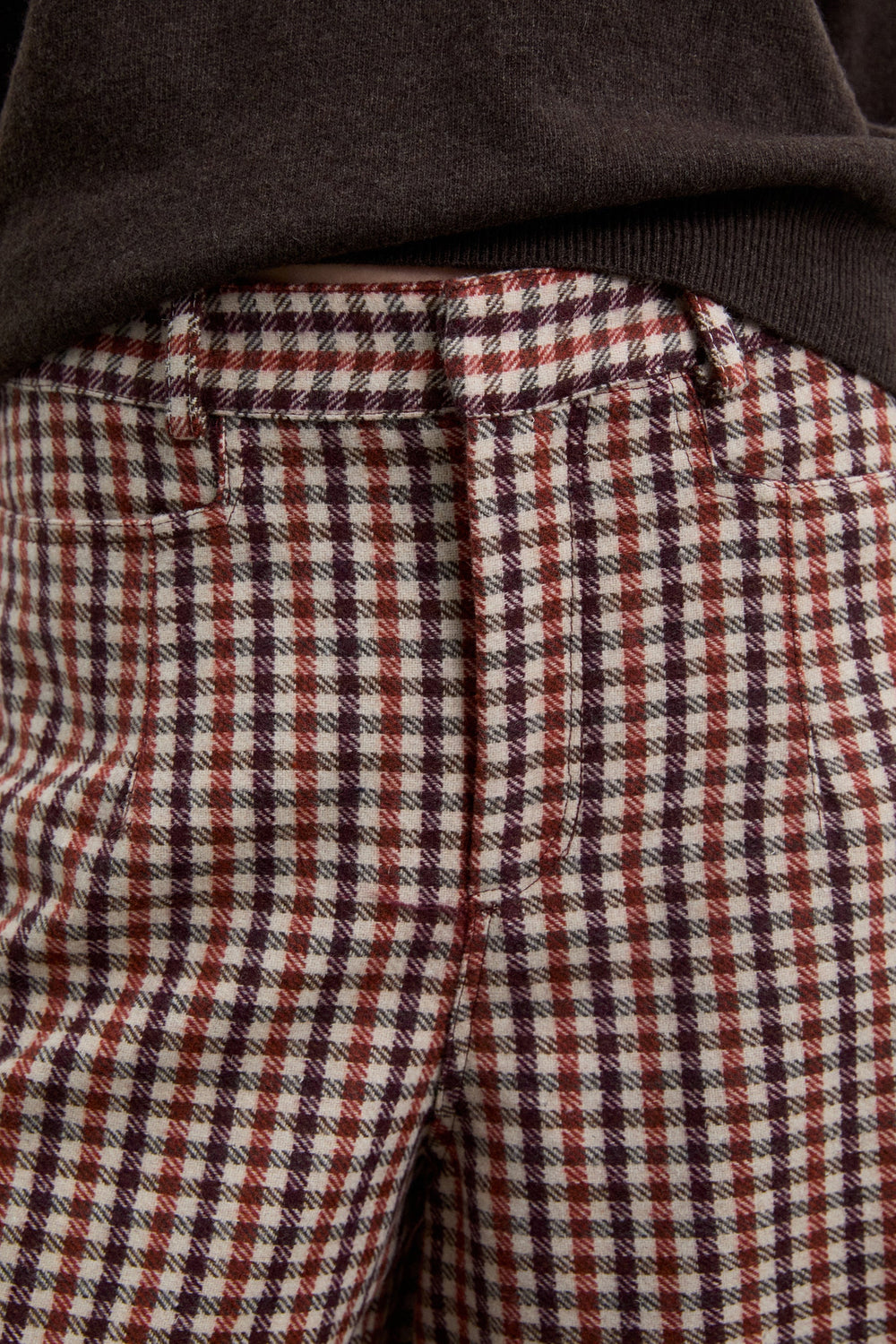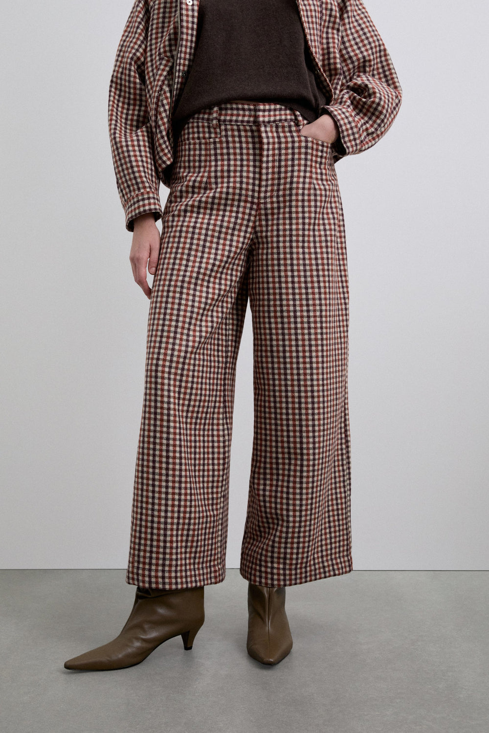 Culottes with check print. Front dart detail. Four pockets. Zip and button fastening.