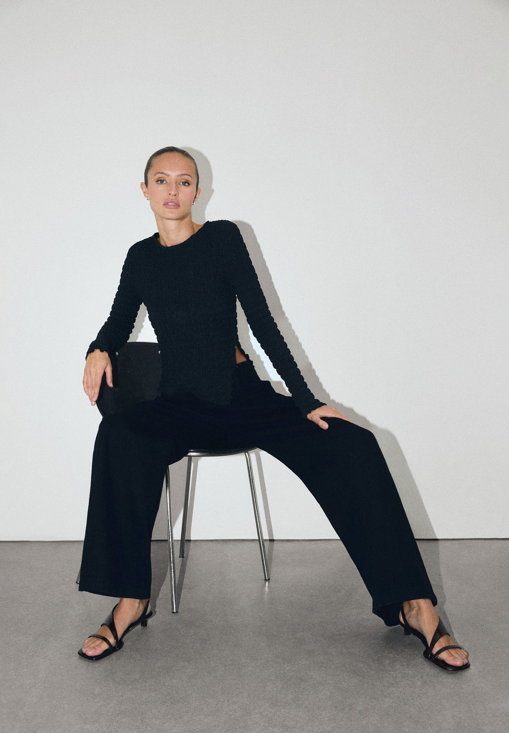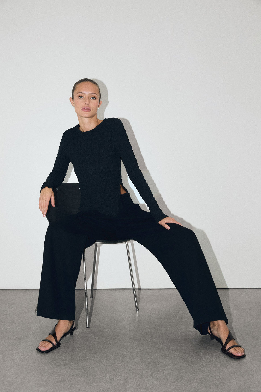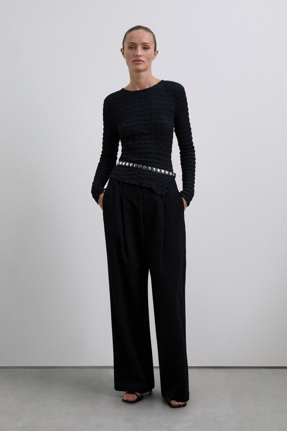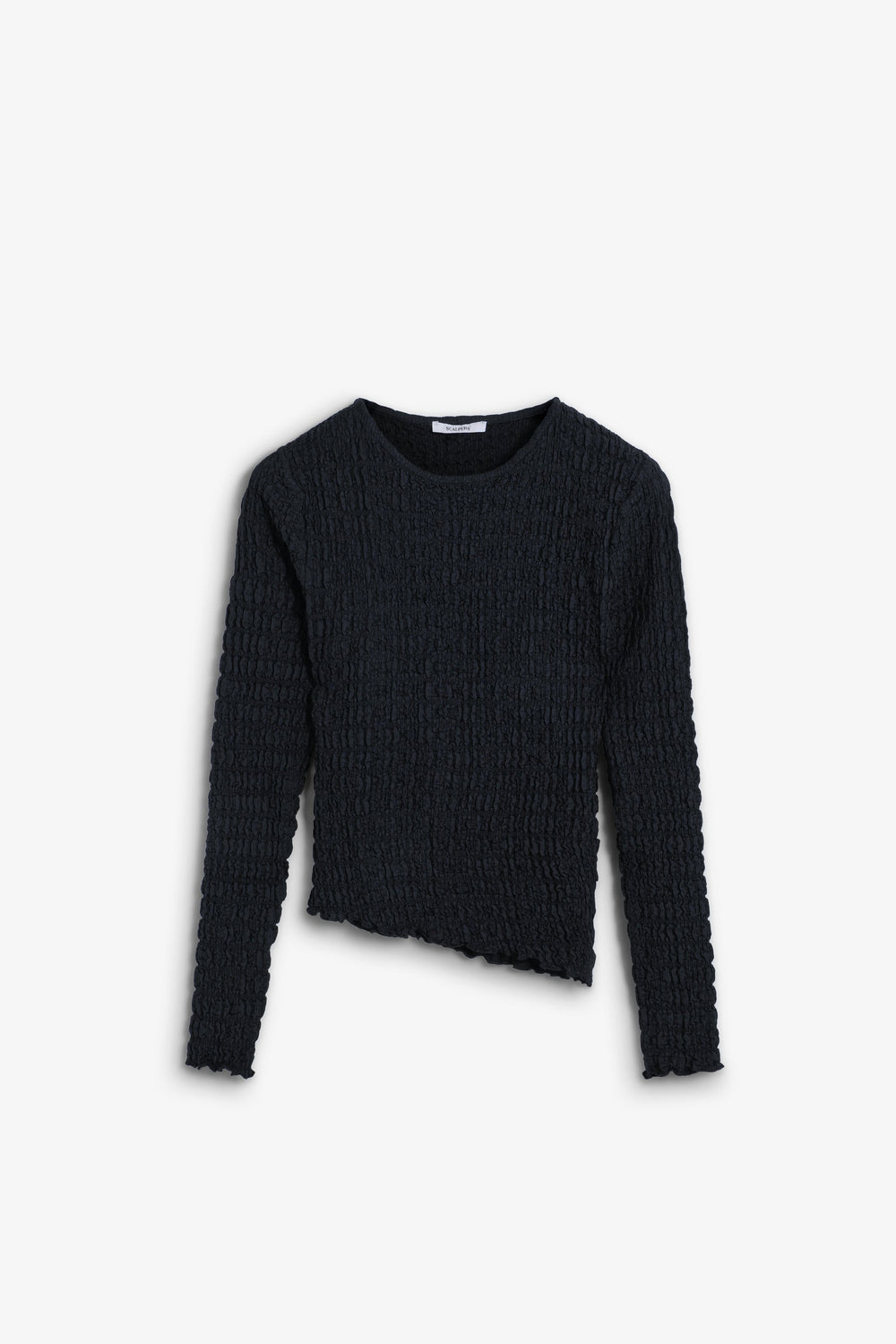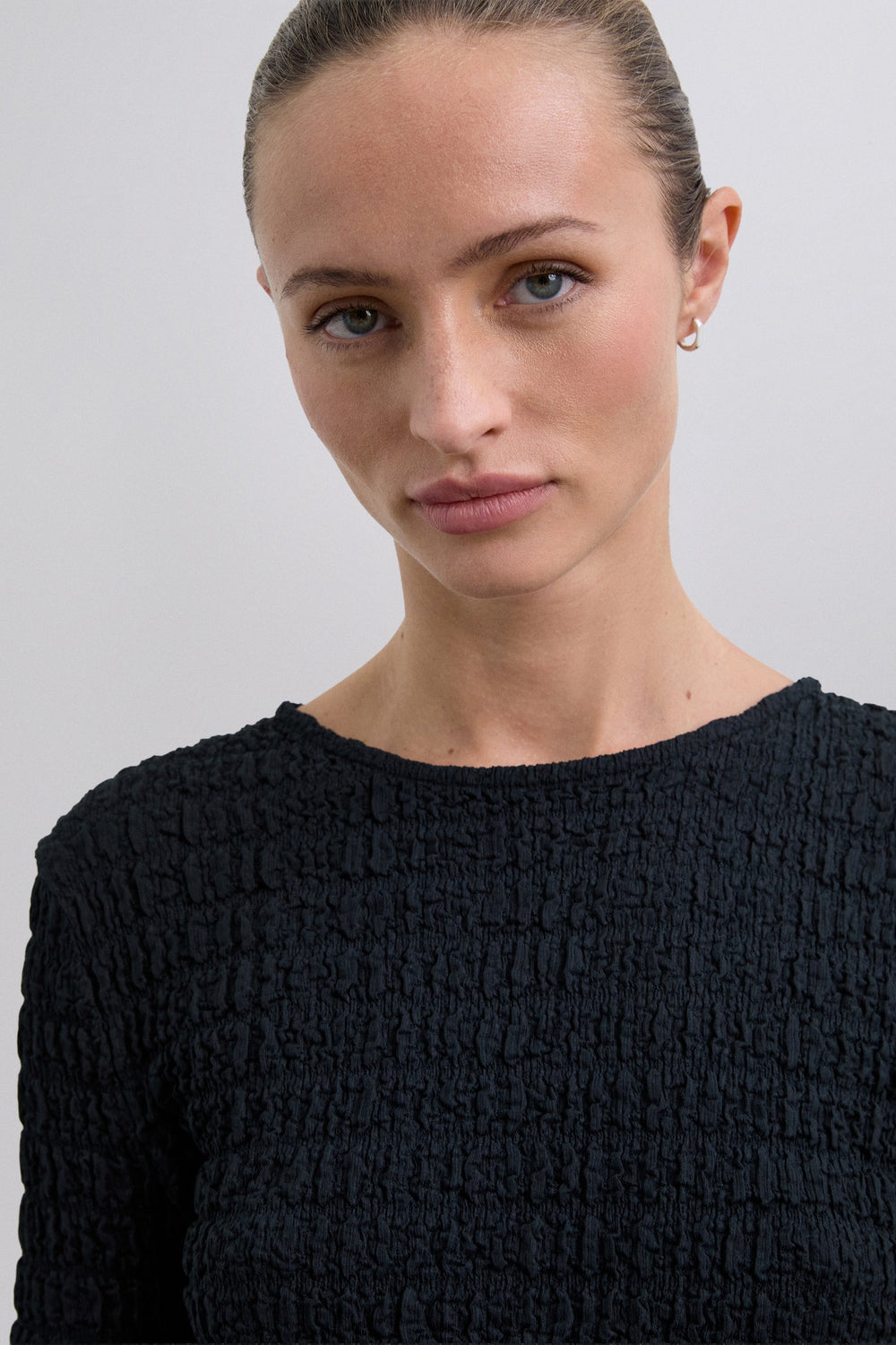 Round neck top with long sleeves. Lightweight fabric with gathered texture.
