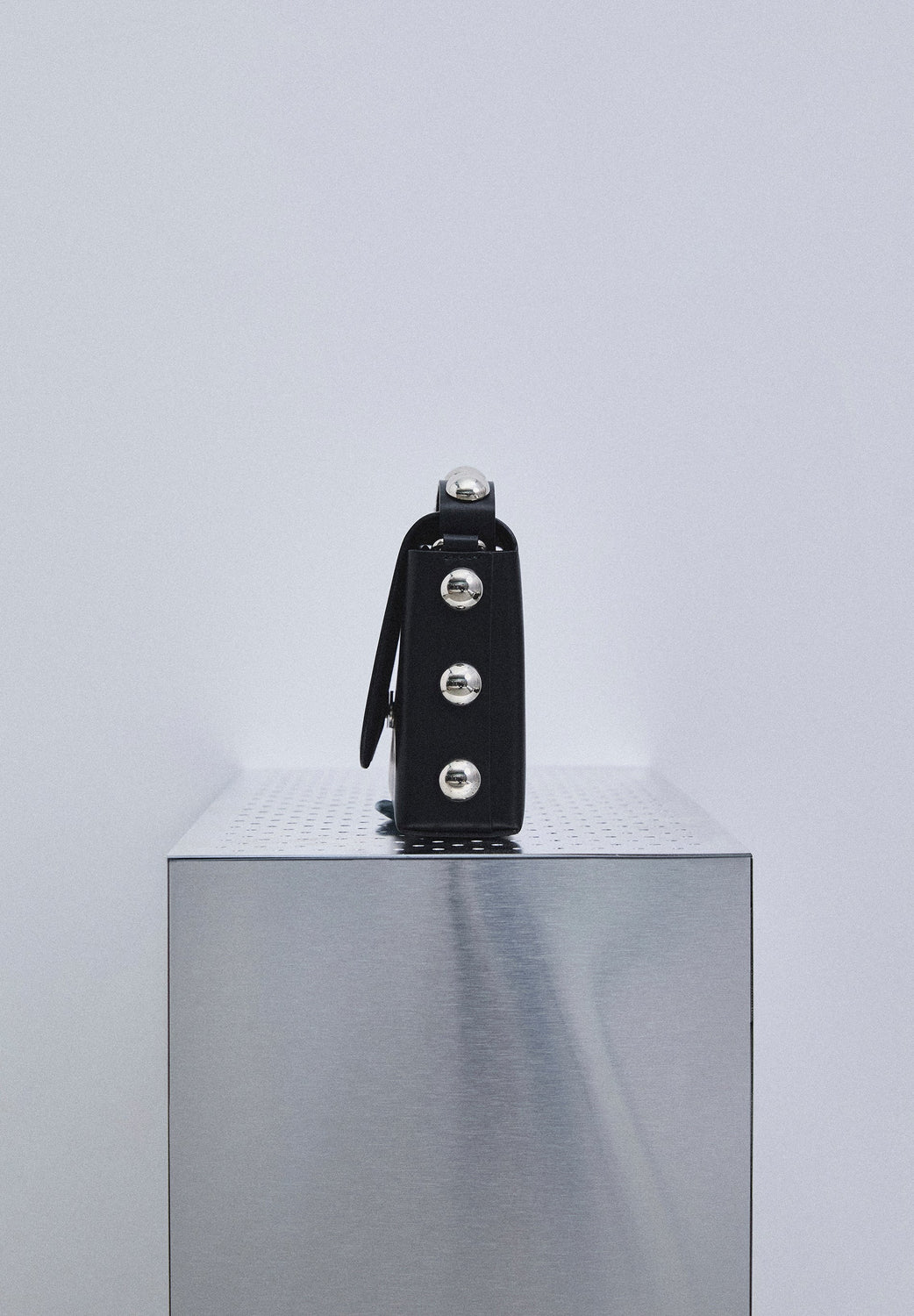Mini bag made in 100% leather with studs details on handle and sides. Metallic logo detail on front.