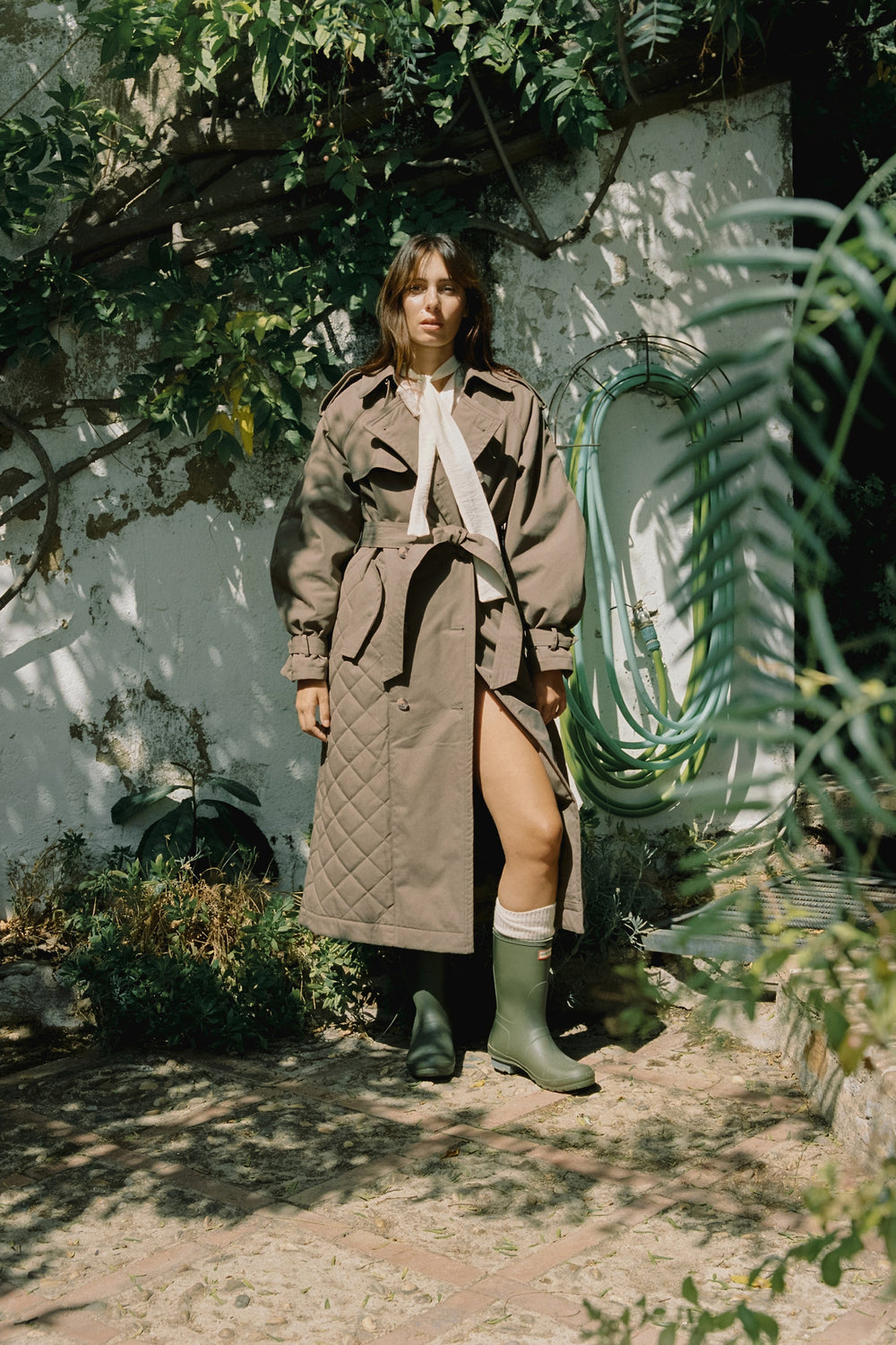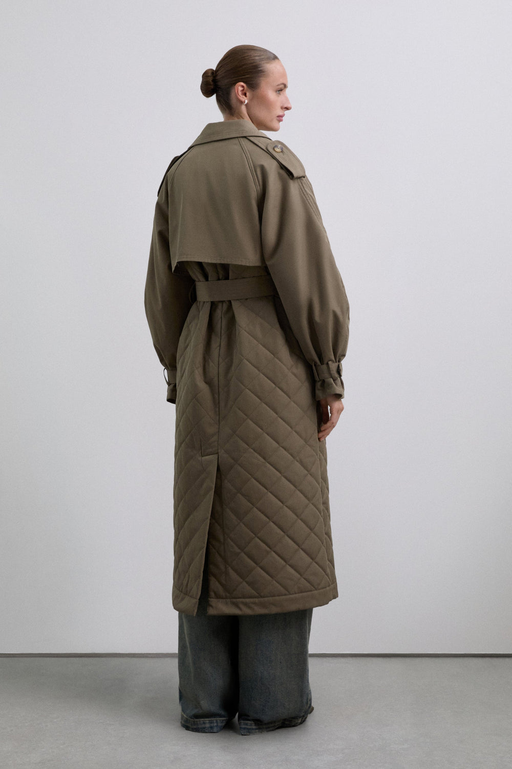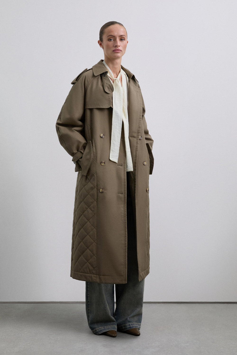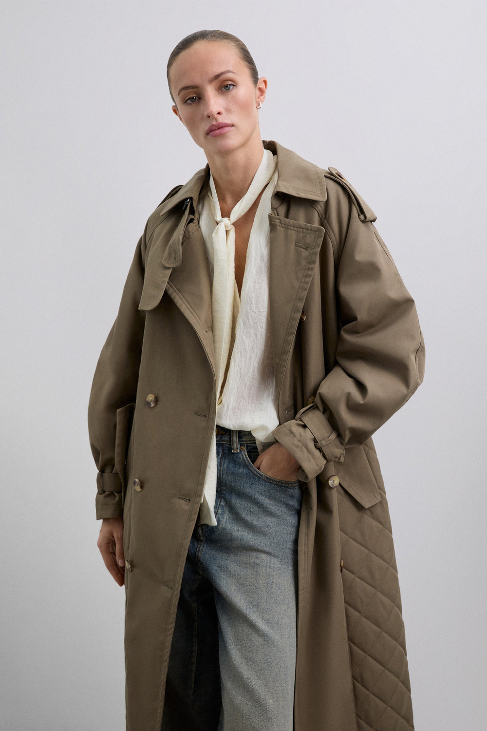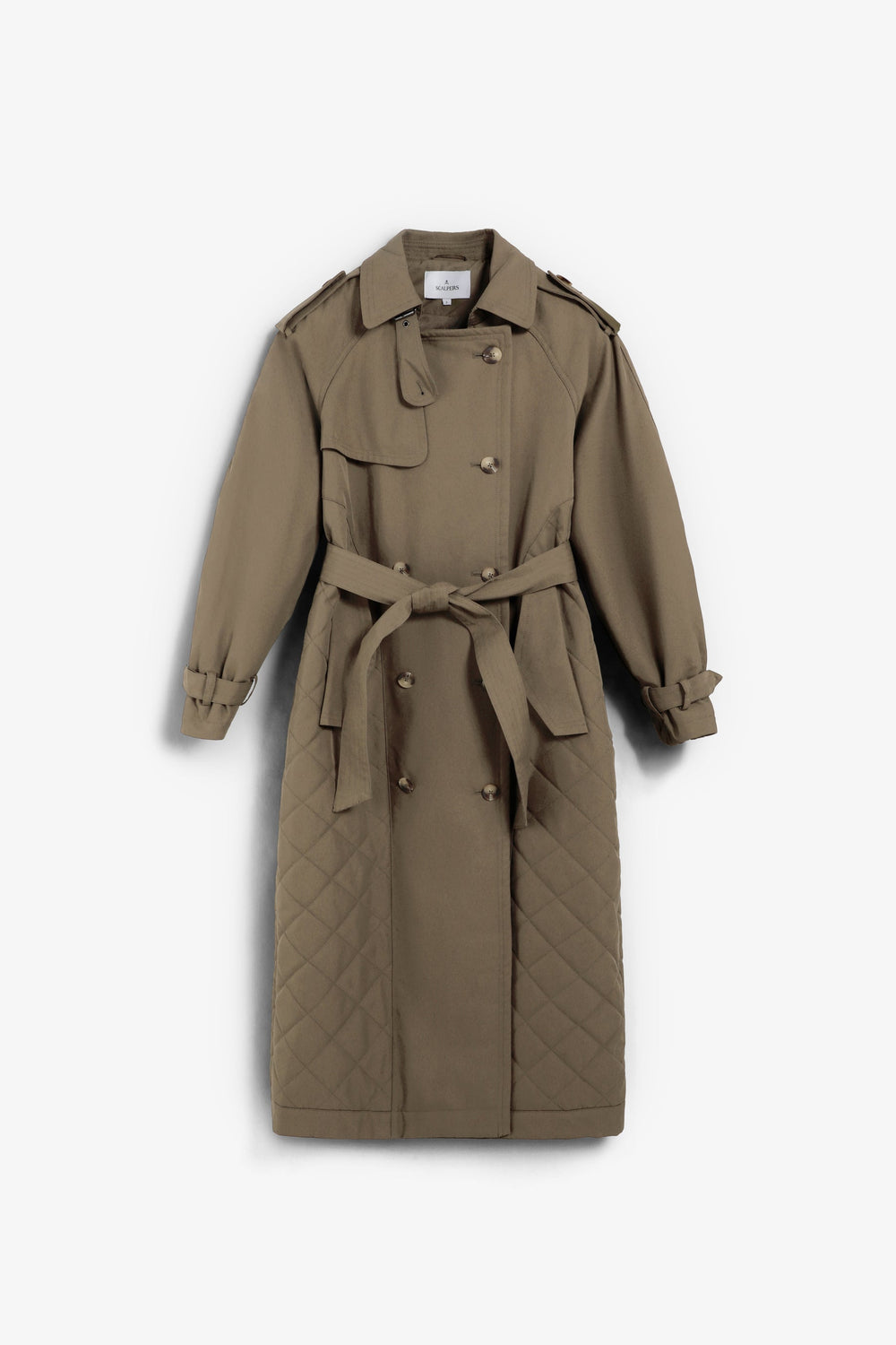 Quilted, waterproof trench coat made of cotton. Quilted detail at the bottom. Slightly oversize sleeves and cuff tabs. Front button fastening and adjustable belt.