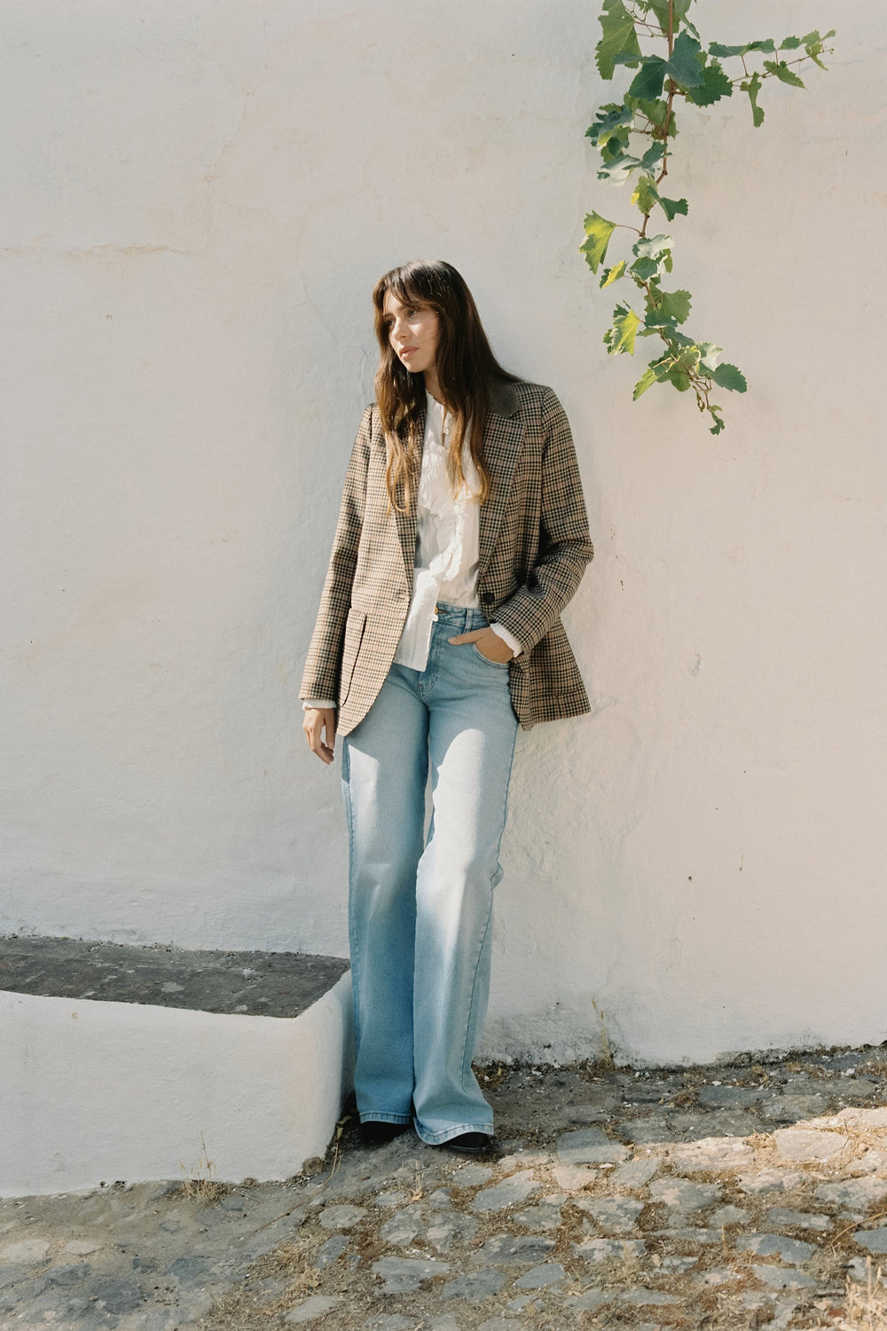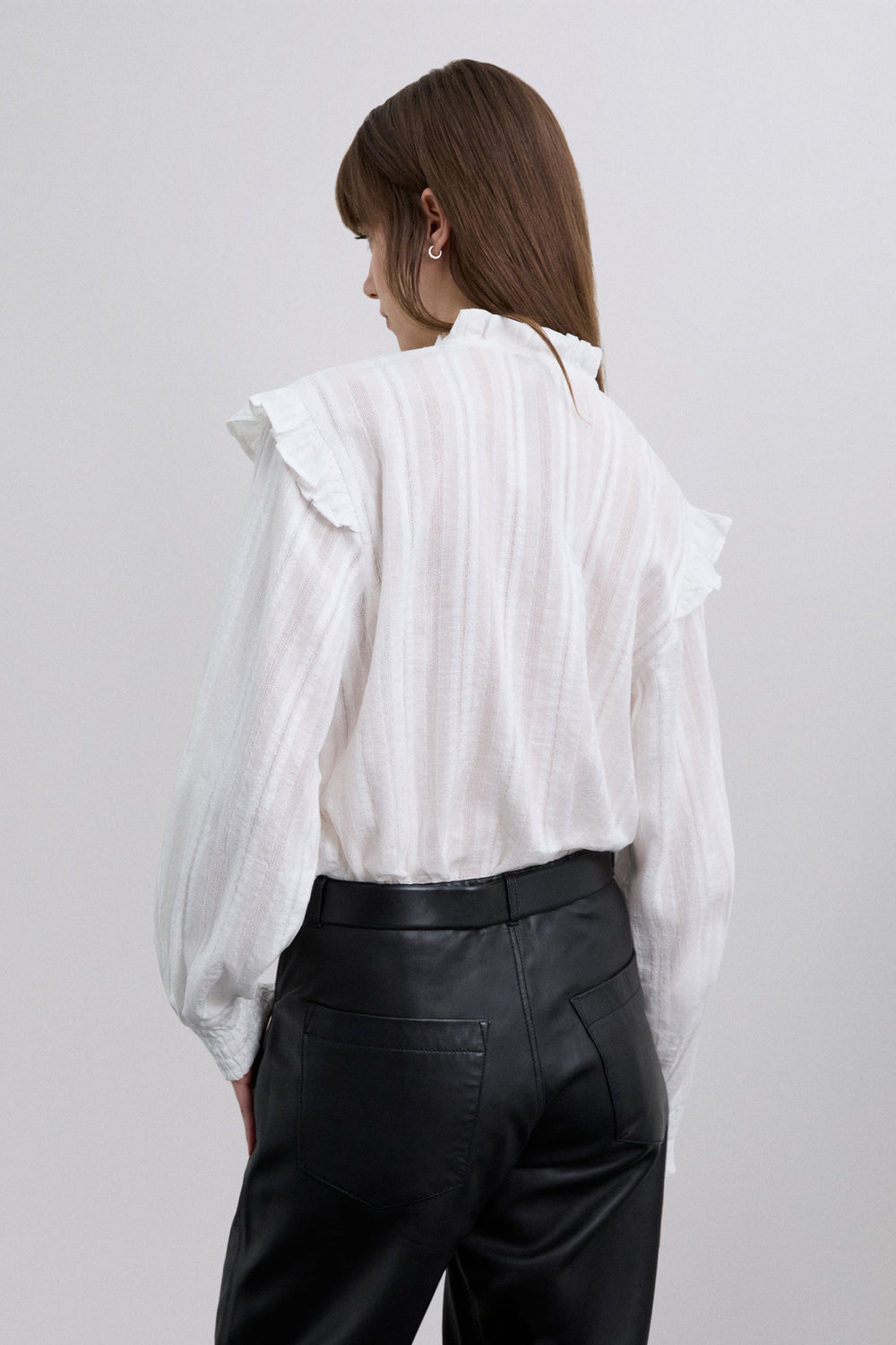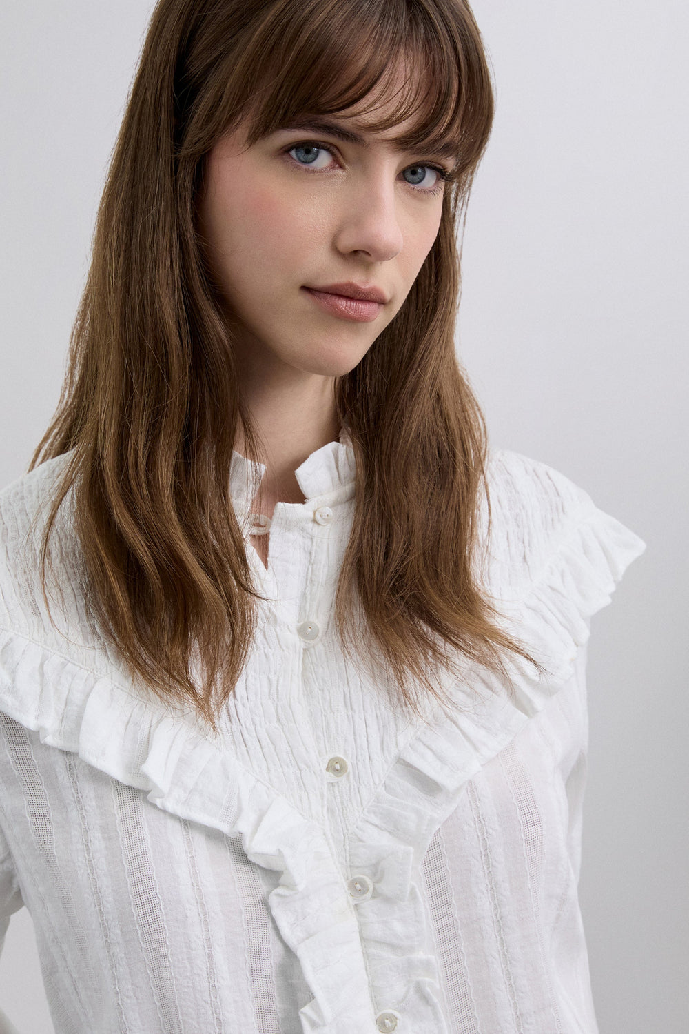 Long sleeve blouse made of 100% cotton. Classic collar and ruffle in smocked fabric. Mother-of-pearl buttons.