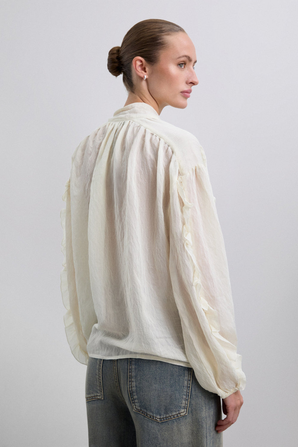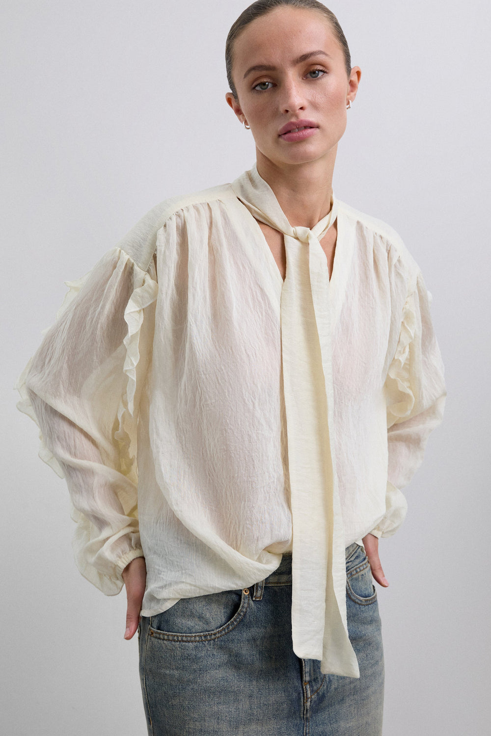 Blouse made of flowing fabric with linen and rayon. Regular Fit. Neckline with tie detail. Front button fastening. Long slightly puffed sleeves with cuffs. Ruffle detailing on the sleeves.
