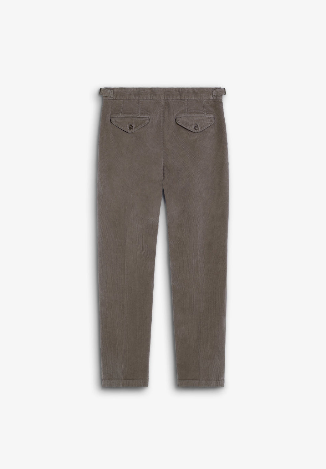 Darted corduroy trousers made of BCI cotton. Slim fit. Metal adjusters on the sides of the waistband; button and zip fastening. Two front pockets and two buttoned back pockets.