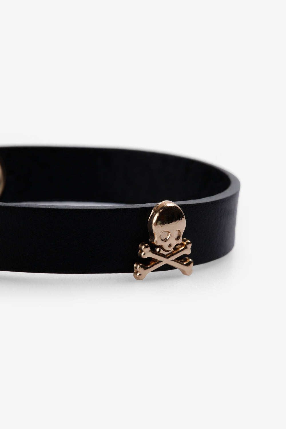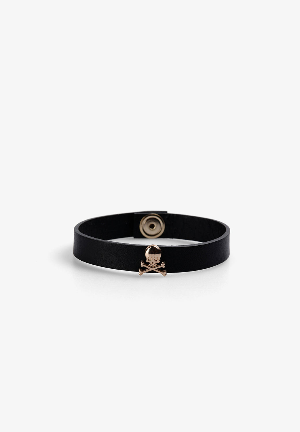 Pulsera confeccionada en piel con detalle de calaveras. Cierre con snap.