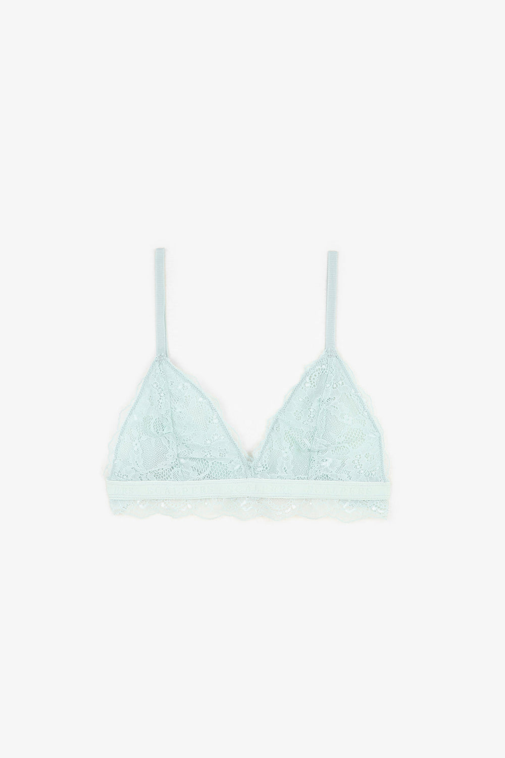 Lace bra made of slightly stretchy fabric. Adjustable shoulder straps, hook-and-eye fastening and elastic bottom band. Lace trim detail on the hem.