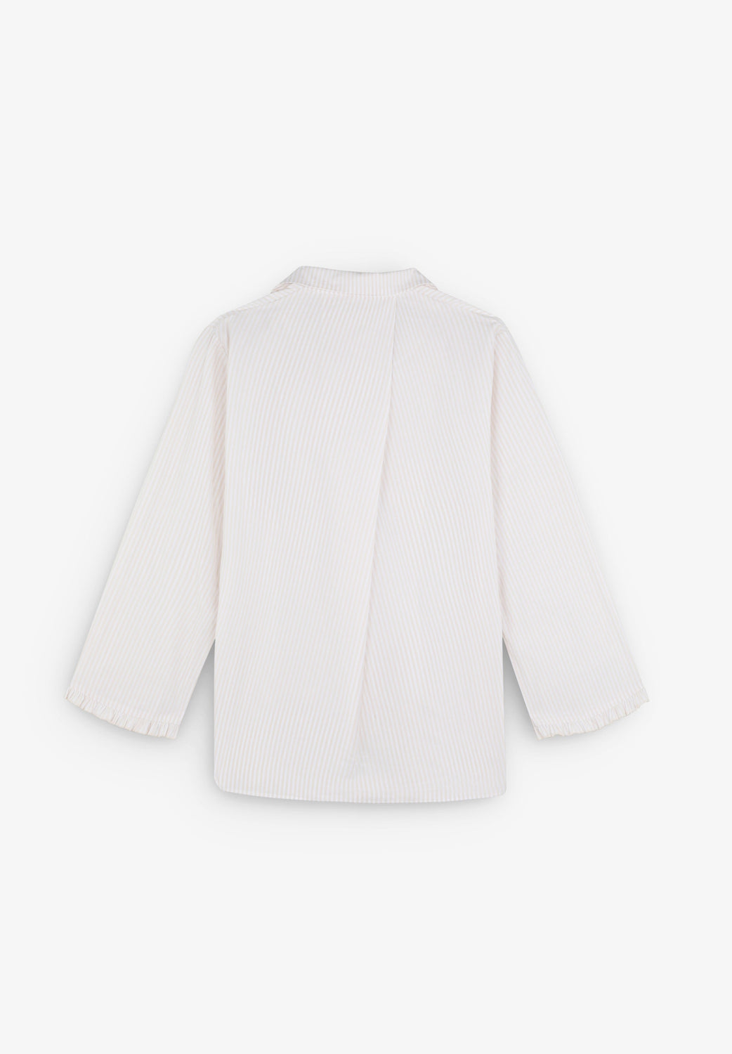 • Kimono-style top with rounded lapel collar. Concealed front button fastening and ties. Long cuffed sleeves with ruffle detail. Back detail with crossed dart