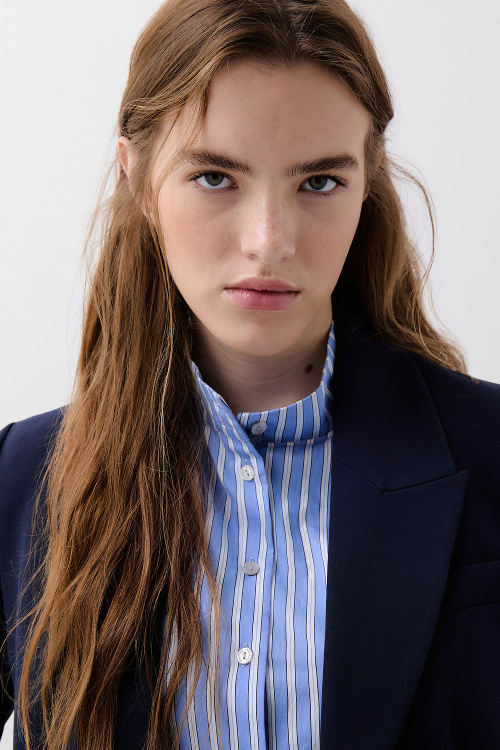 Structured blazer. Made of slightly stretchy fabric. Straight cut. Lightweight shoulder pads. Lapel collar. Button fastening. Long sleeves with slit details on cuffs. Jetted pockets.
