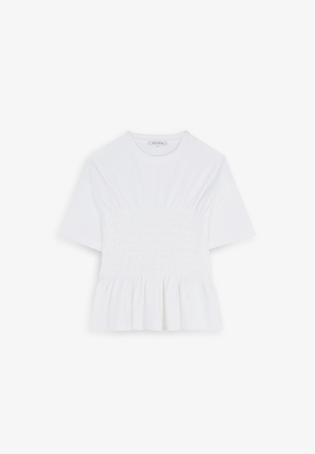 T-shirt made of slightly stretchy cotton blend fabric. Regular fit, round neck and short sleeves. Smocking detail at waist with ruffle on the hem.