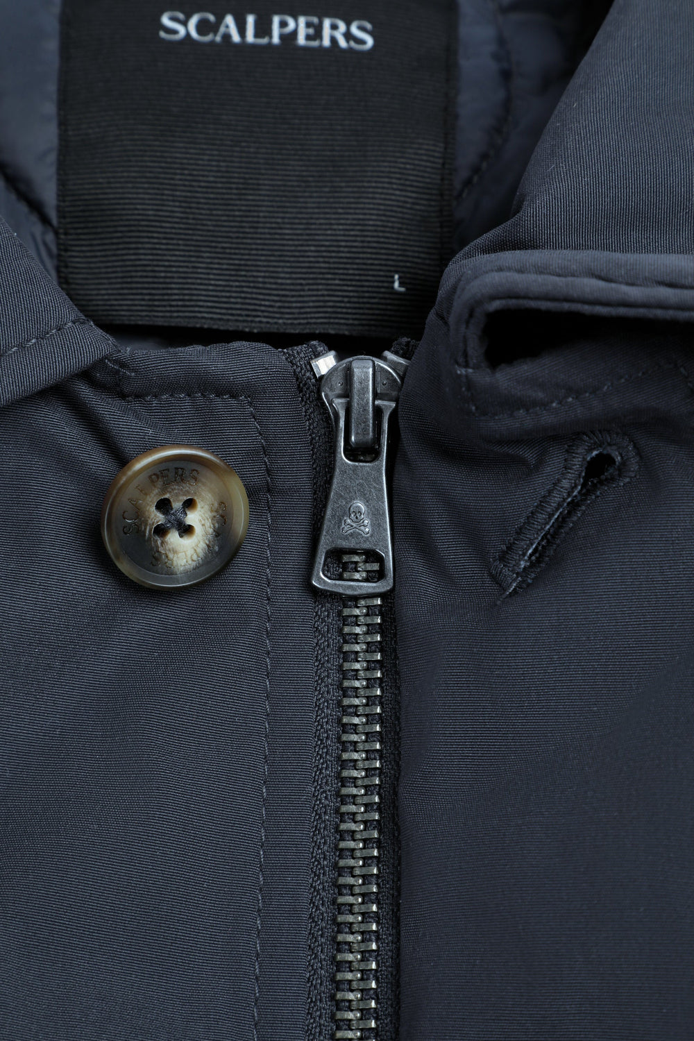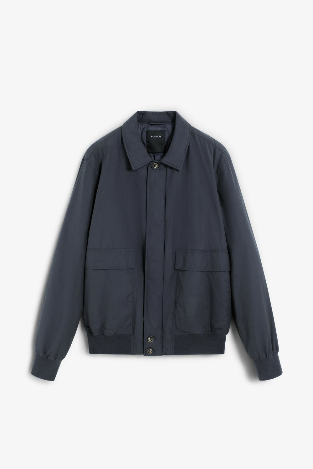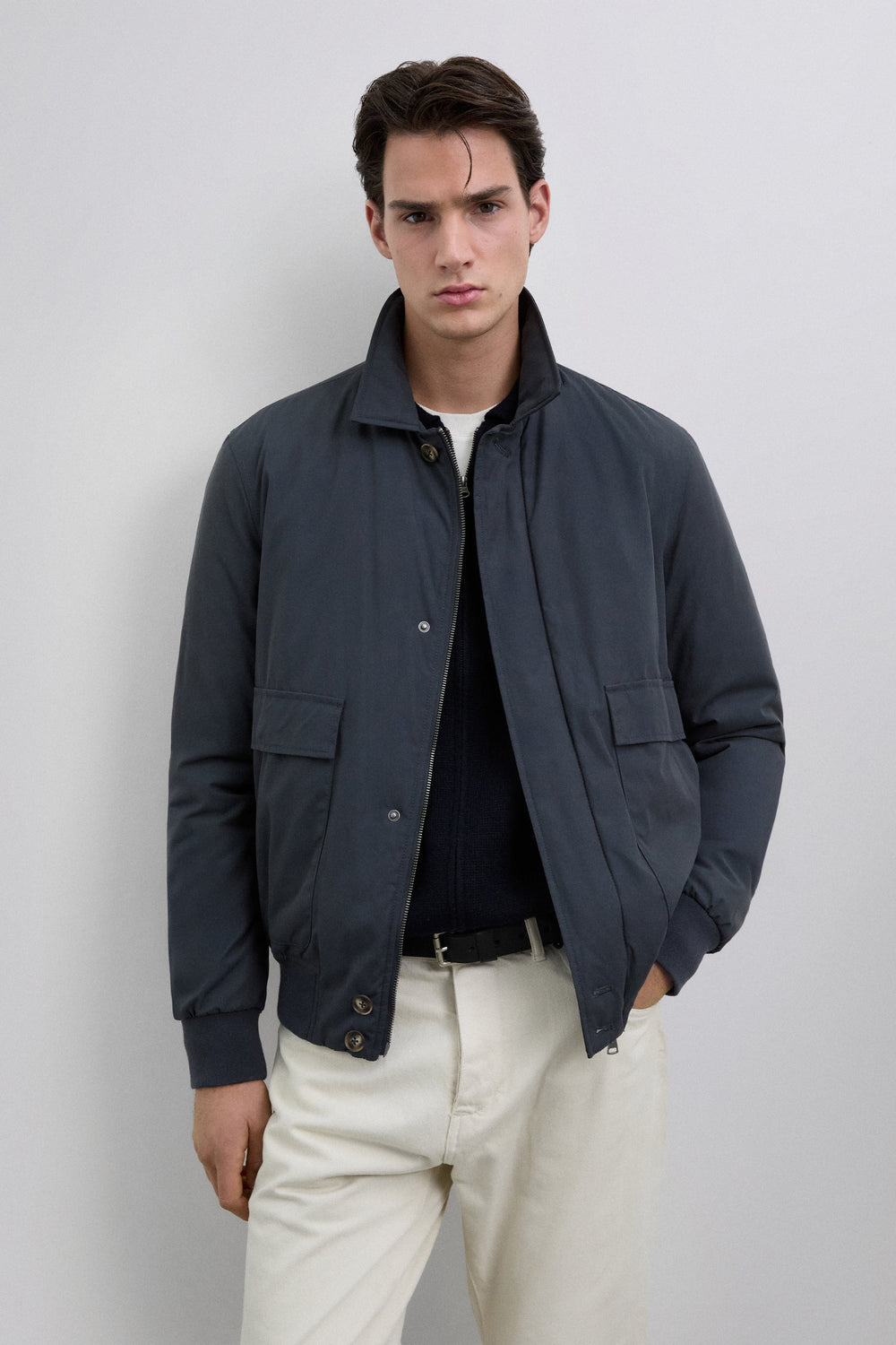 Bomber jacket made of a cotton blend. Button and concealed zip fastening. Front flap pockets. Side pockets. Padded lining. Inner zipped jetted pocket. Ribbed cuffs and hem. Logo detail on the sleeve.